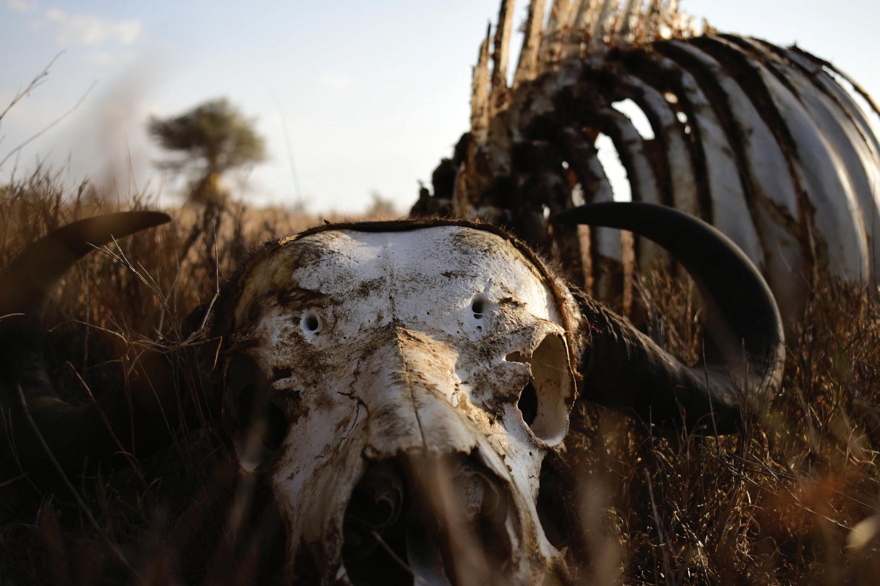 A buffalo skeleton lies forgotten in the coarse savanna grass.