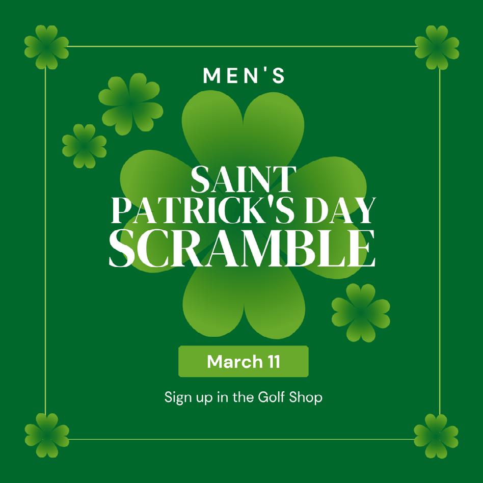 March marks the start of Spring, and the start of lots of social activites at the Club. Tennis has a Round Robin this month, and each month through the Spring. We’ve already had our Men’s Golf Kickoff and this month the guys will be playing in a St Patrick’s Scramble on Mar 11. In Food & Beverage, we are offering a special St Patrick’s Day Dinner on Mar 17 (see page 14). Then, on Mar 23, we have a special Oak Farms Wine Dinner. The menu will be posted soon, but will be gluten-free!
