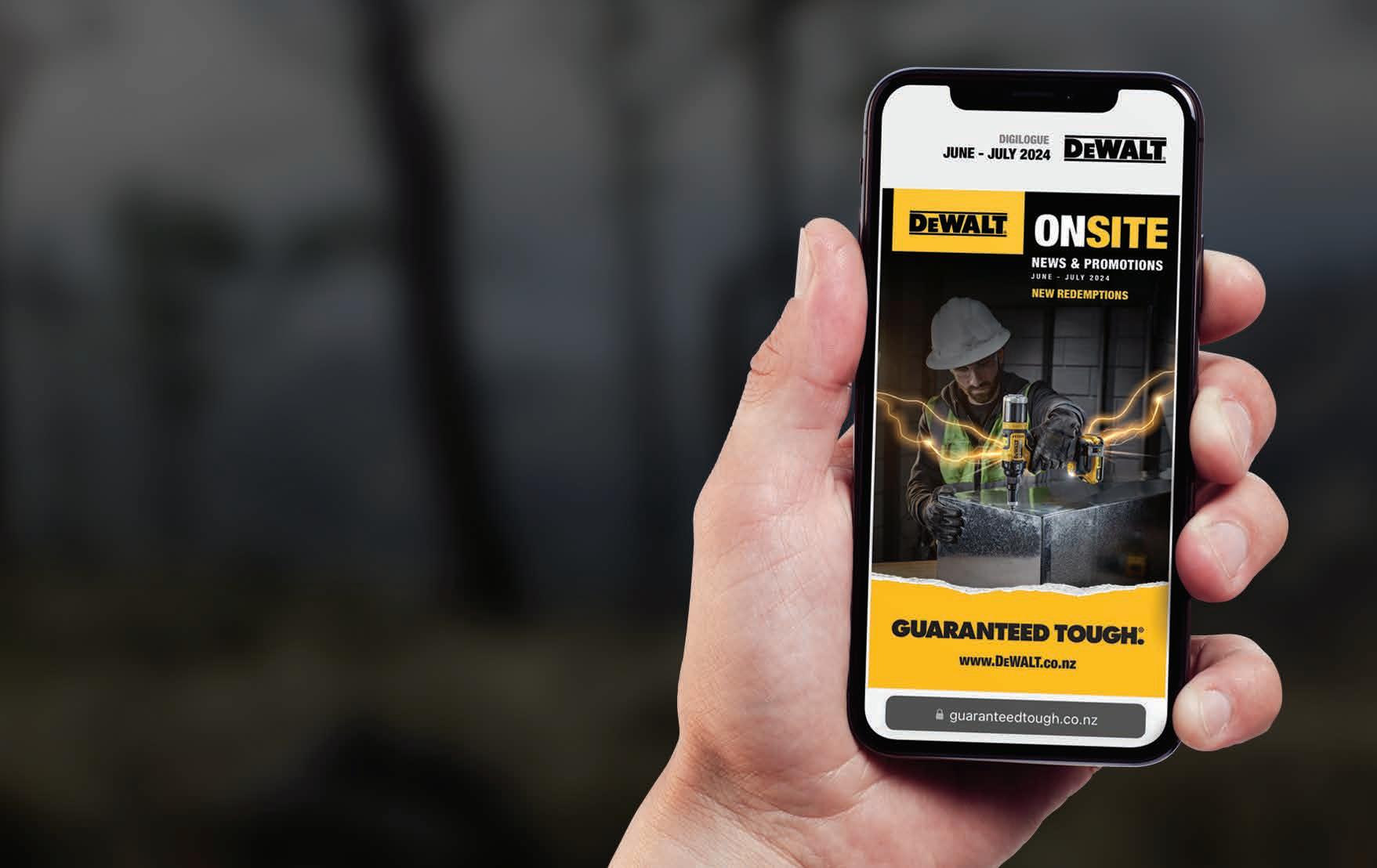 DELIVERY MAY TAKE UP TO 45 DAYS FROM RECEIPT OF ENTRY. SIGNATURE REQUIRED UPON DELIVERY. ITEMS WILL NOT BE LEFT UNATTENDED. NO PO BOXES ACCEPTED. DELIVERIES LIMITED TO MAINLAND NEW ZEALAND. PACIFIC ISLANDS AND OFF-SHORE ADDRESSES NOT ACCEPTED. THIS OFFER CANNOT BE USED IN CONJUNCTION WITH ANY OTHER OFFER. TO REDEEM OFFER OR TO SEE FULL TERMS AND CONDITIONS VISIT WWW.GUARANTEEDTOUGH.CO.NZ Redemption offers are valid only to those consumers who purchase one of the selected DEWALT NZ products between 1st June 2024 until the 31st July 2024. Proof of purchase is essential to validate claim. Receipt must clearly show model of tool purchased, date of purchase, place of purchase and the price paid to substantiate the claim. DEWALT NZ reserves the right to request further information regarding proof of purchase from the redeemer if circumstances warrant. Keep your original receipt for warranty purposes as proof of purchase. Goods must be fully paid for at the time of purchase and on ONE receipt to be eligible. DEWALT NZ accepts no liability for claims that may be delayed, misdirected or lost in the mail causing them to not be received by the closing date. Redemption offers will be dispatched within 45 working days of receipt of the claim while stocks last. This redemption offer is not valid to employees of DEWALT NZ. All Redemption Offer claims must be received by 14th August 2024. This promotion cannot be used in conjunction with any other offer, limited stock available. Offer available while stocks last. An alternative redemption item may be provided at the discretion of DEWALT NZ. Offer only valid when product purchased through authorised resellers of DEWALT NZ. Excludes parallel importers. DEWALT 20 El Kobar Drive, East Tamaki, Auckland 2013 New Zealand Telephone: 0800 421 006 Accessories as a trademark. DEWALT reserves the right to change any deal, price and / or specification at any time without notice. Onsite Offers promotion runs from 01/06/2024 - 31/07/2024. Deals available while stocks last and only at participating stores. CARRY THE ONSITE CATALOGUE ON YOUR DEVICE AND NEVER MISS A REDEMPTION. SCAN TO VIEW CATALOGUE OR VISIT GUARANTEEDTOUGH.CO.NZ SIGN UP TO TODAY PLAY NOW FOR A CHANCE TO WIN* *Only 1 free entry per person, purchase required for each subsequent bonus entry. T&CS apply, see www.dewalt.eu/nz/wtwt/#terms. NZ res 18+ only. Starts: 8/4/24. Ends: 23:59 14/11/24. Must register for an account. Retain receipt/s for all entries attached to a purchase. Max 2 bonus entries p/person p/day. There are 8 Prize Draws. Each Prize Draw will take place at 11am GMT at TPN U.K, Waterslade House, Thame Rd, Haddenham, Buckinghamshire HP7 8NT, UK on 3/5/24, 4/6/24, 3/7/24, 5/8/24, 4/9/24, 3/10/24, 5/11/24, & 18/11/24. Winners notified in writing within 7 days of the draw.