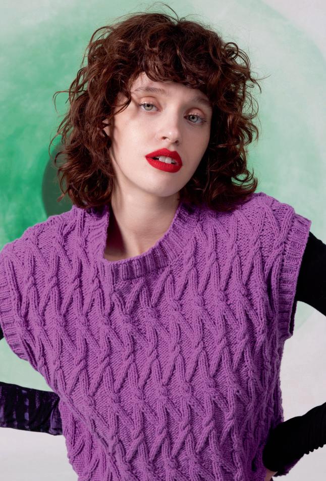 Like a bed of moss with light shimmering on it through the leaves on the trees, the colours and designs in this section have a magical quality. Inspired by the fullness of nature, here you will find textures and cables that play with the light, complemented by airy, voluminous yarns. Add a touch of refined elegance to your winter wardrobe with a combination of luminous greens and rich, deep violet tones.