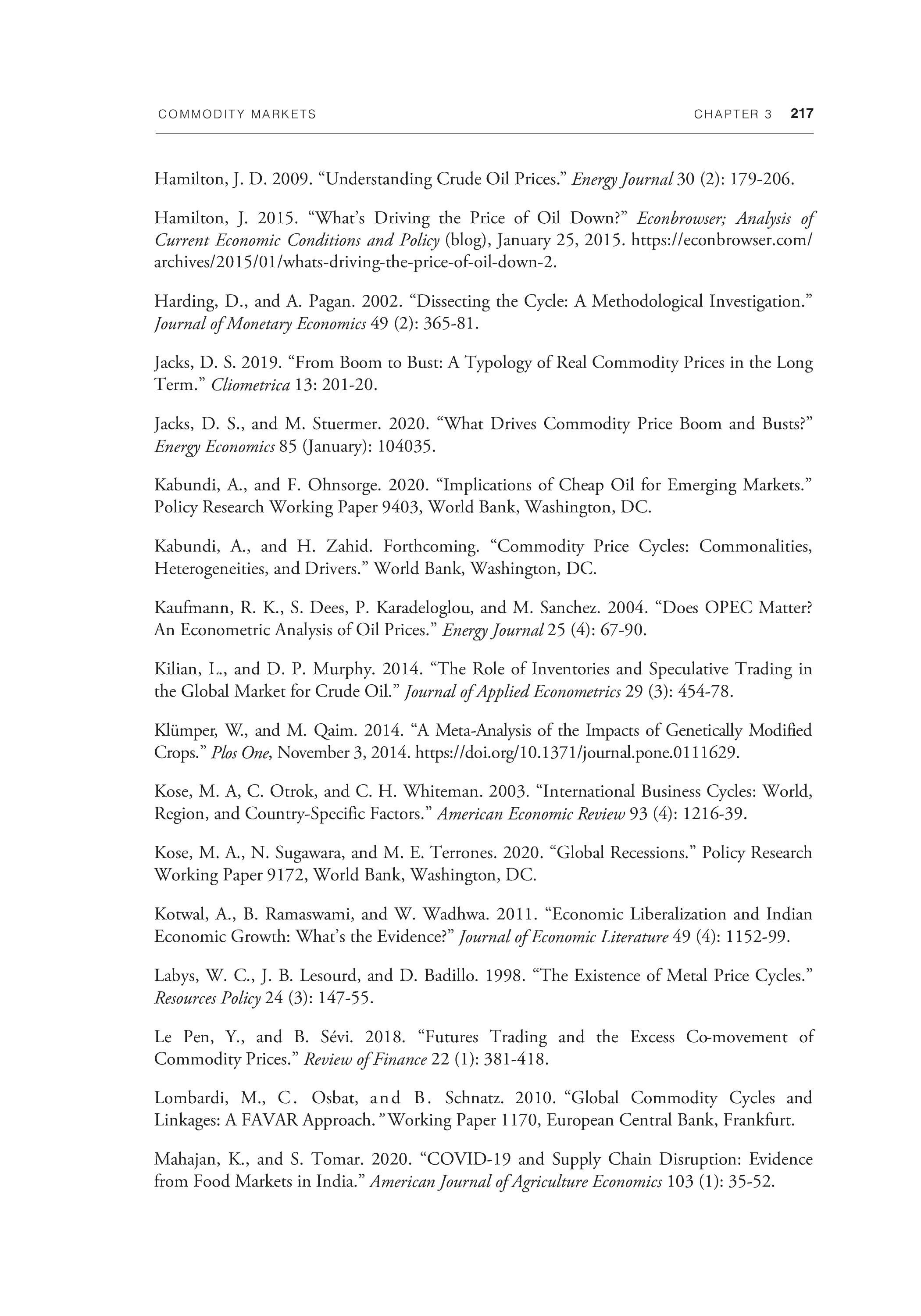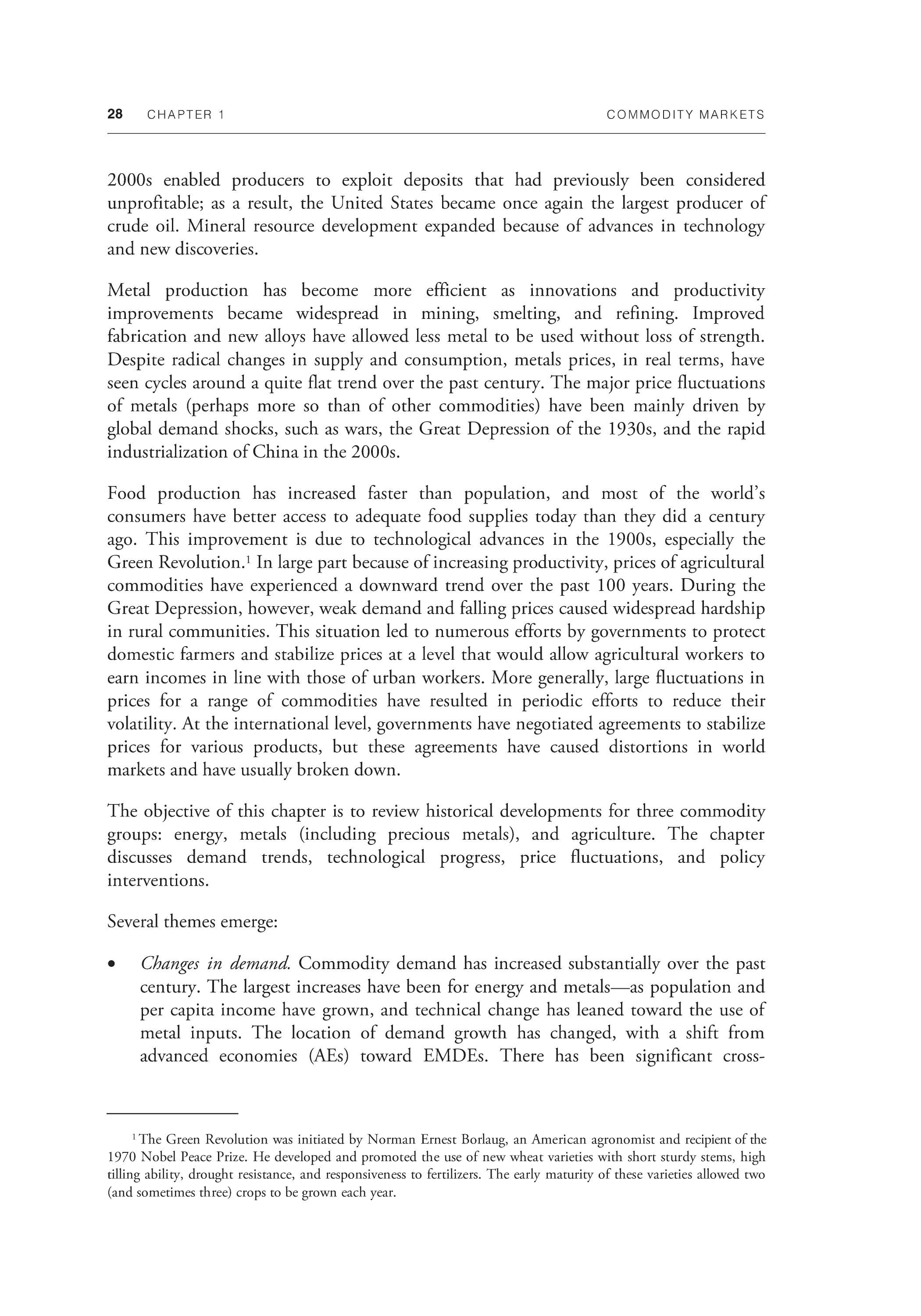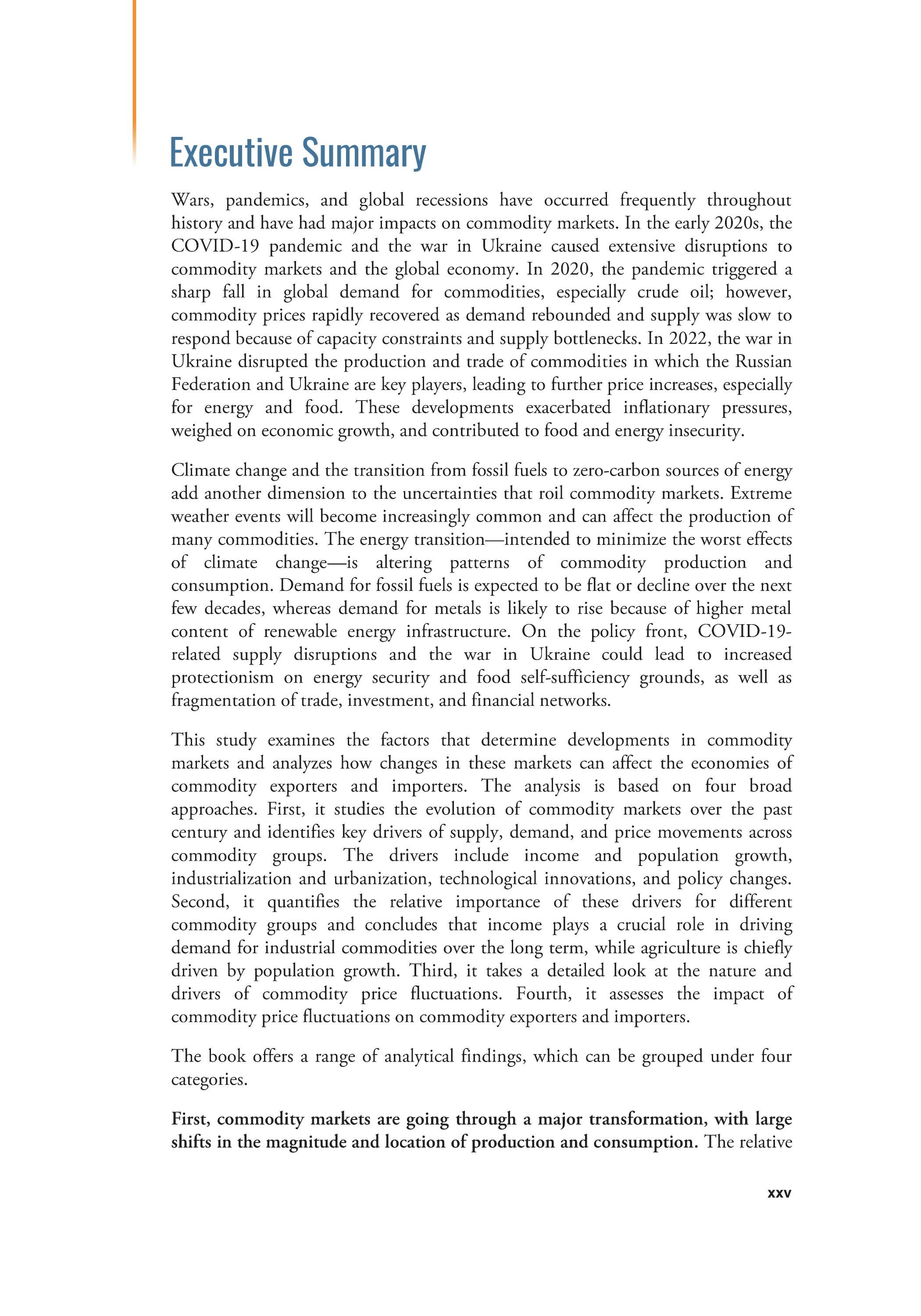 "Commodity markets are integral to the global economy. Understanding what drives developments of these markets is critical to the design of policy frameworks that facilitate the economic objectives of sustainable growth, inflation stability, poverty reduction, food security, and the mitigation of climate change. This study is the first comprehensive analysis examining market and policy developments for all commodity groups, including energy, metals, and agriculture, over the past century. It finds that, while the quantity of commodities consumed has risen enormously, driven by population and income growth, the relative importance of commodities has shifted over time, as technological innovation created new uses for some materials and facilitated substitution among commodities. The study also shows that commodity markets are heterogeneous in terms of their drivers, price behavior, and macroeconomic impact on emerging markets and developing economies, and that the relationship between economic growth and commod