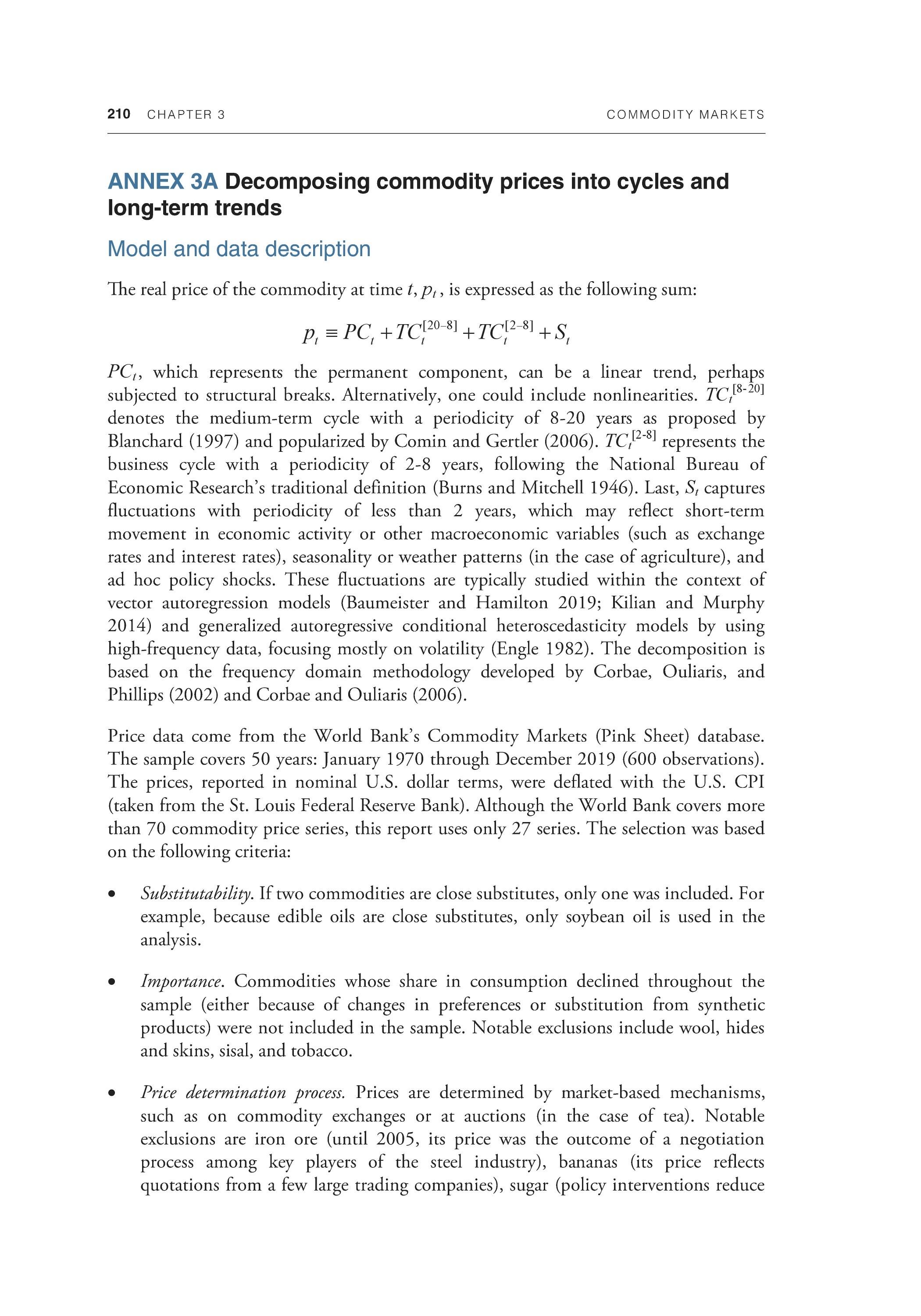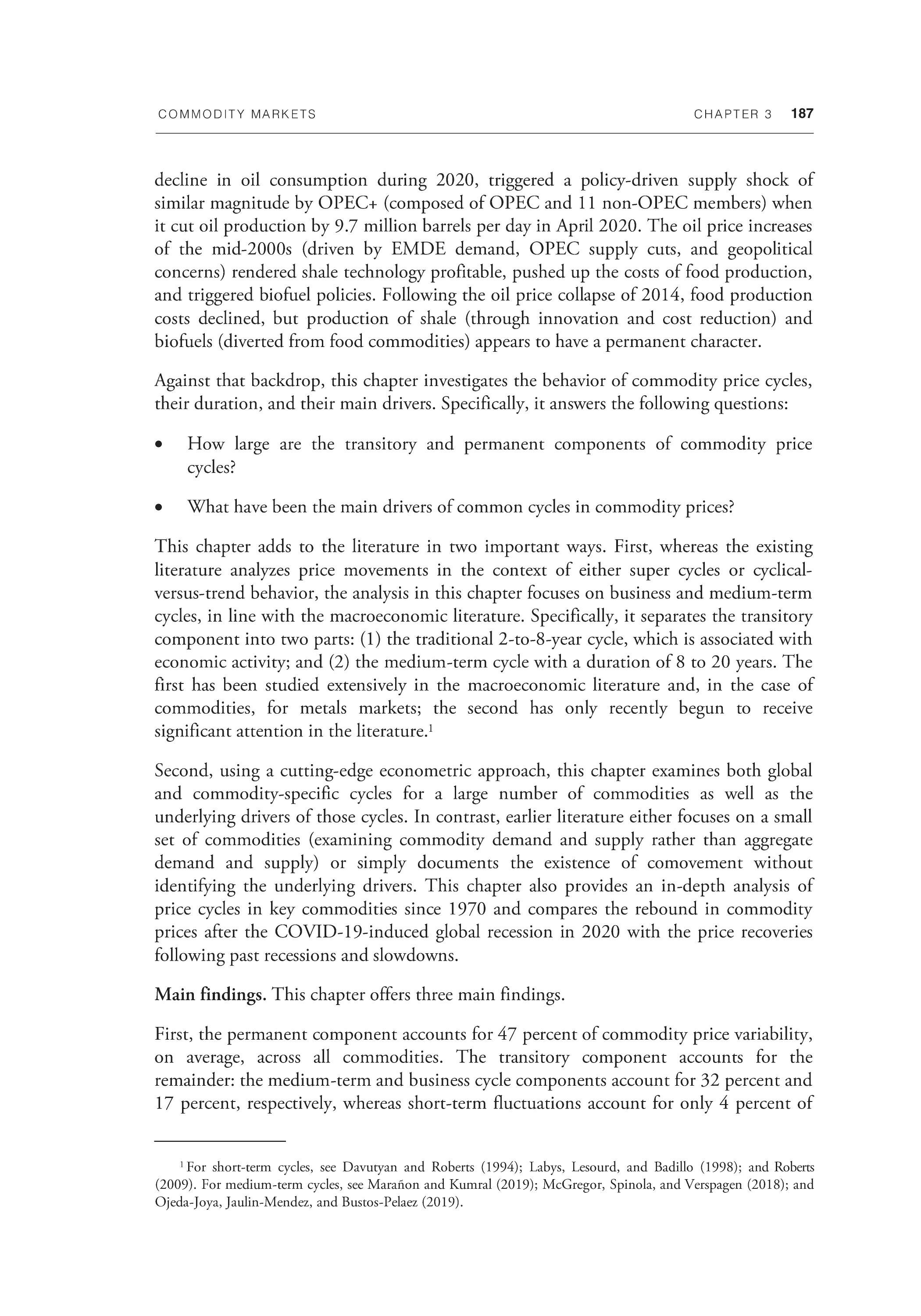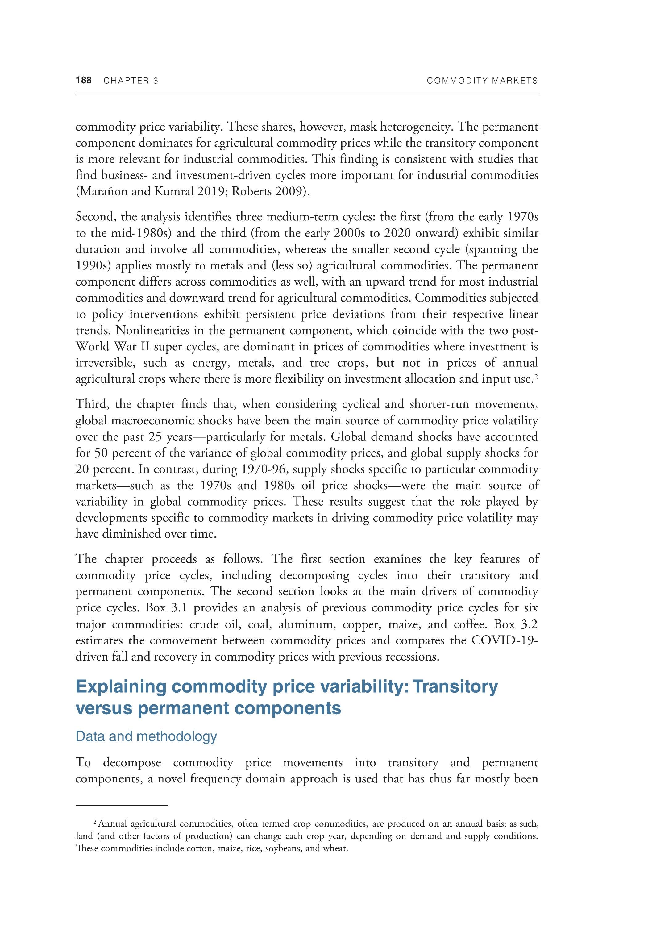 "Commodity markets are integral to the global economy. Understanding what drives developments of these markets is critical to the design of policy frameworks that facilitate the economic objectives of sustainable growth, inflation stability, poverty reduction, food security, and the mitigation of climate change. This study is the first comprehensive analysis examining market and policy developments for all commodity groups, including energy, metals, and agriculture, over the past century. It finds that, while the quantity of commodities consumed has risen enormously, driven by population and income growth, the relative importance of commodities has shifted over time, as technological innovation created new uses for some materials and facilitated substitution among commodities. The study also shows that commodity markets are heterogeneous in terms of their drivers, price behavior, and macroeconomic impact on emerging markets and developing economies, and that the relationship between economic growth and commod