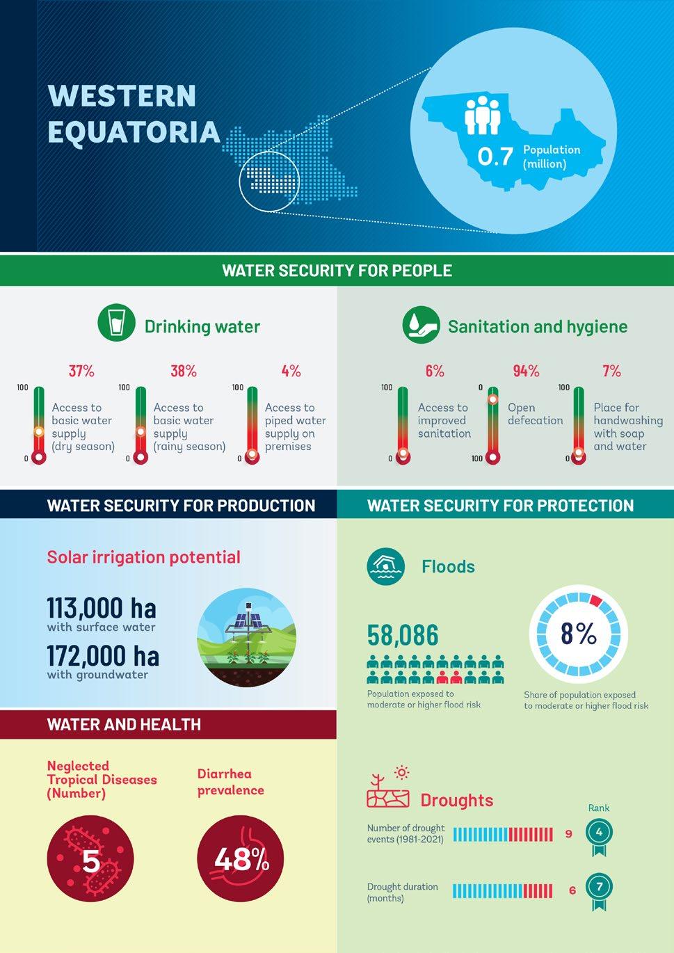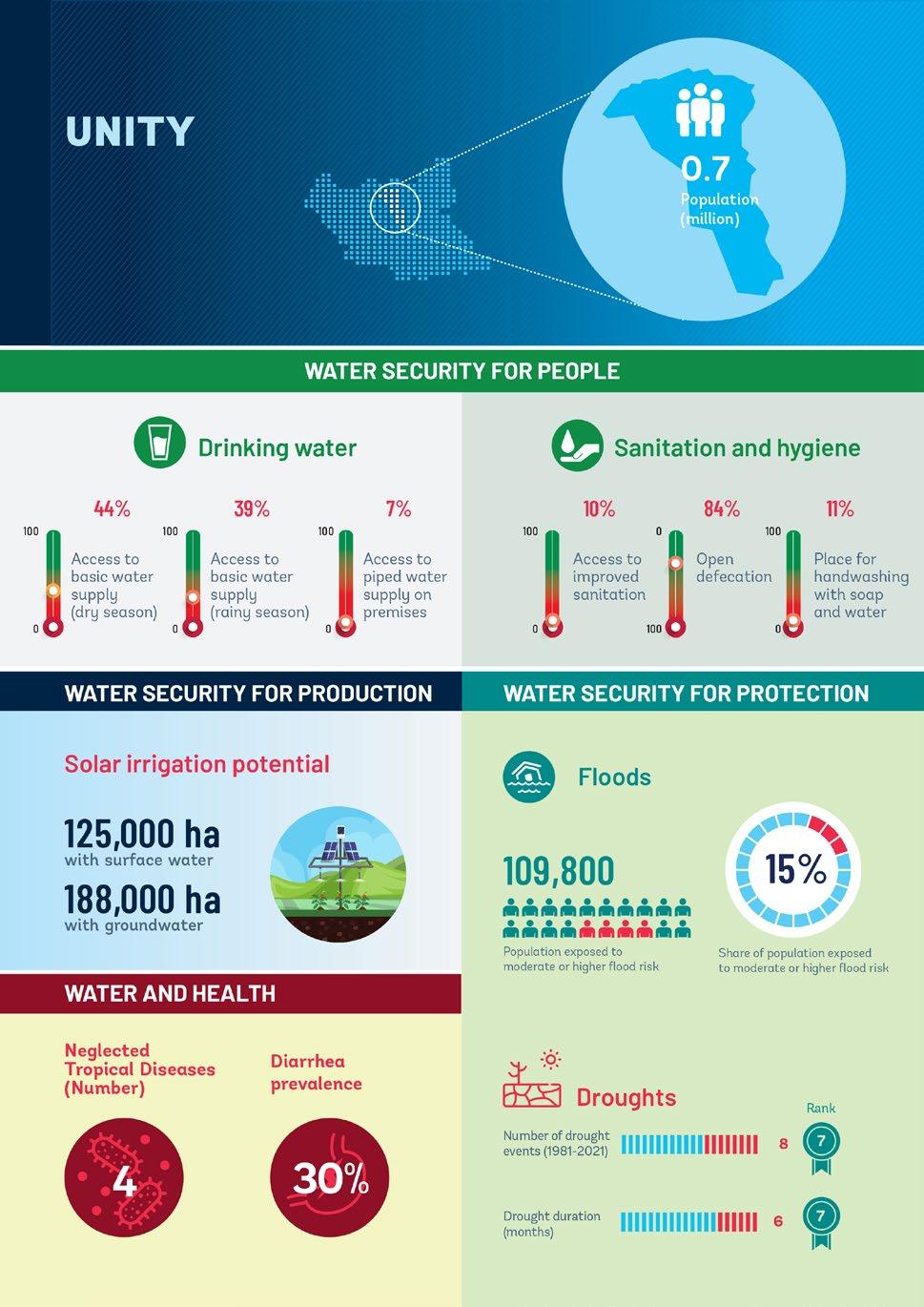 With a focus on water security for people, production, and protection, the report shows that water insecurity is an existential threat to South Sudan. One in two South Sudanese live in areas exposed to moderate flood hazard; the country ranks seventh in the world for share of population exposed to river floods. Lack of access to safe drinking water supply and sanitation is also a core concern: more than 60 percent of the population use unimproved sources and 75 percent practice open defecation. Women and girls tend to be disproportionately impacted by these water-related threats. The report illustrates the negative implications of these challenges on health and nutrition, forced displacement, gender, and conflict.