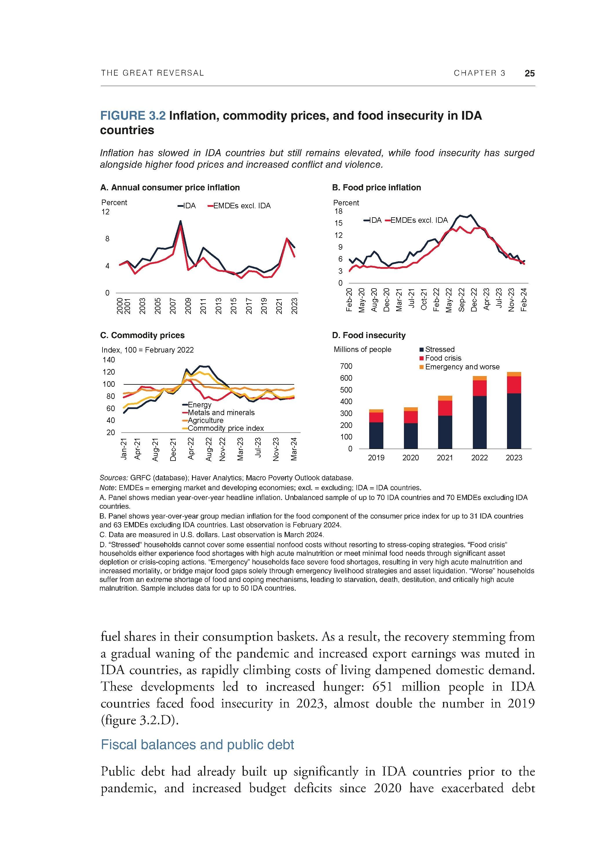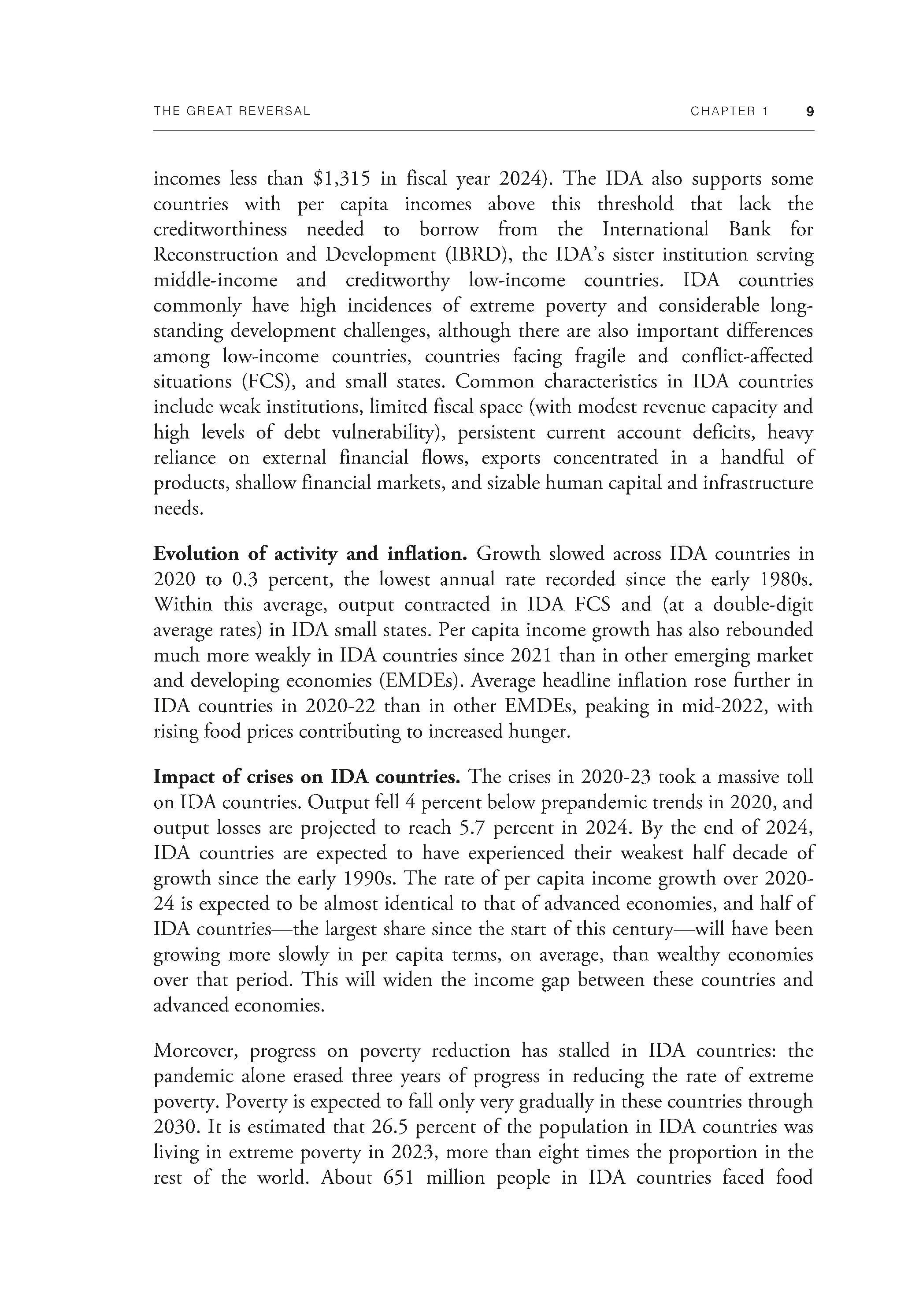 The shock of the pandemic and subsequent overlapping crises has exacerbated the challenges facing these economies and led to a reversal in development: over 2020-24, per capita incomes in half of IDA countries—the largest share since the start of this century—have been growing more slowly than those of wealthy economies. One out of three IDA countries is poorer than it was on the eve of the pandemic. Poverty remains stubbornly high, hunger has surged, and amid fiscal constraints and rising investment needs, the development outlook could take an even bleaker turn—espec