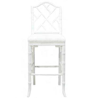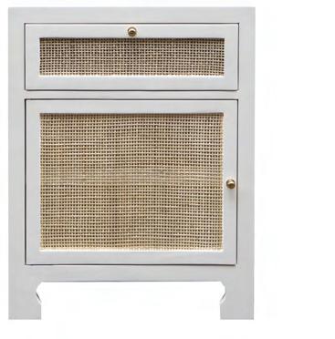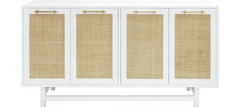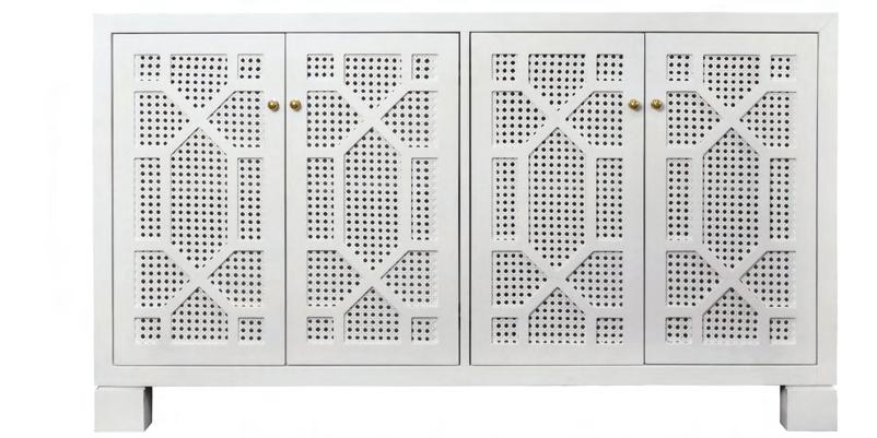 Four-door buffet with trellis over painted cane doors in matte white lacquer. 33h x 58w x 20d