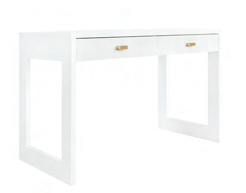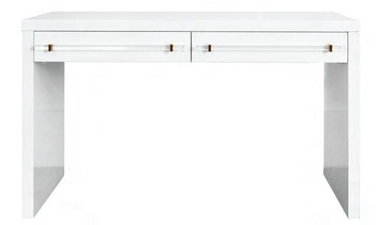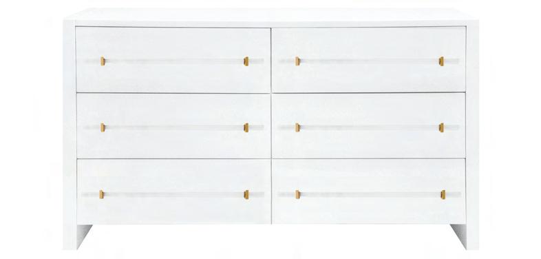 Six-drawer, fluted buffet with brass knobs in glossy white lacquer. 34h x 58w x 18d