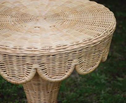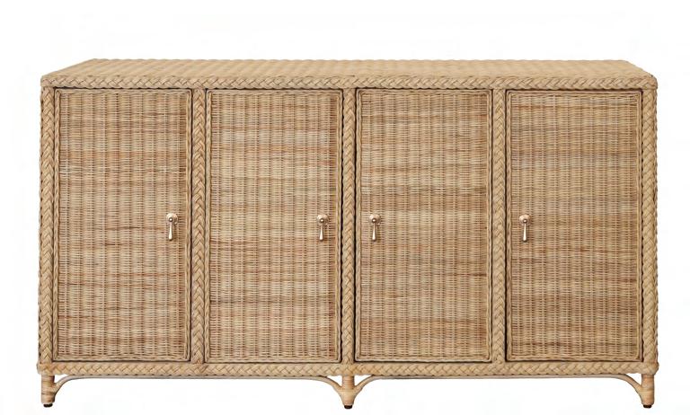 Four-door buffet in fully wrapped matural rattan with satin brass pulls. 34h x 62.5w x 20.5d