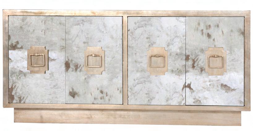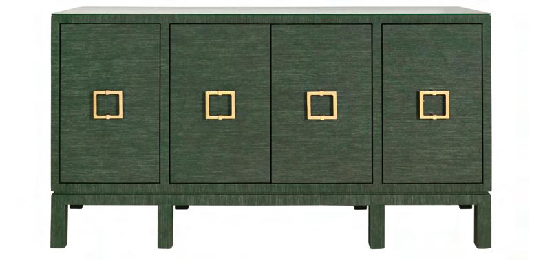 Four-door buffet in green dyed grasscloth with large brass square hardware. 35.5h x 62w x 20d Also seen on page 56.