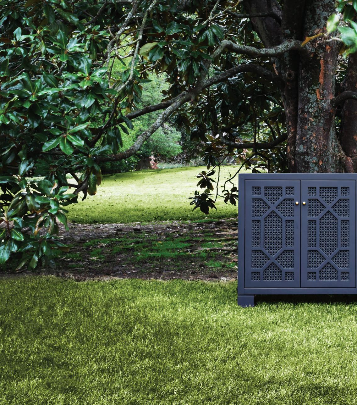 Four-door buffet with trellis over painted cane doors in matte navy lacquer. 33h x 58w x 20d