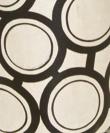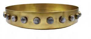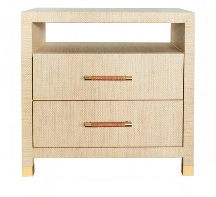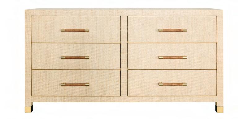 Four-door buffet with antique brass circle hardware in natural grasscloth. 34h x 58w x 20d