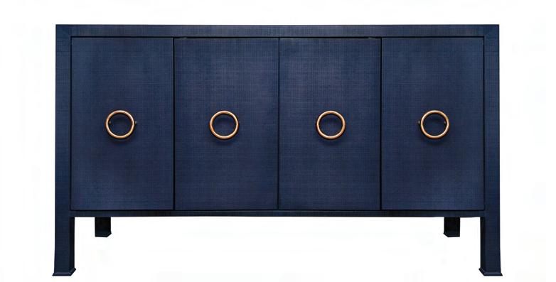 Four-door buffet with antique brass circle hardware in textured navy linen. 34h x 58w x 20d