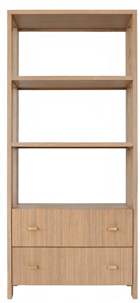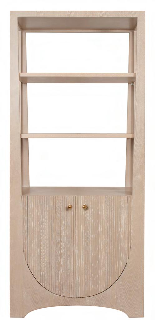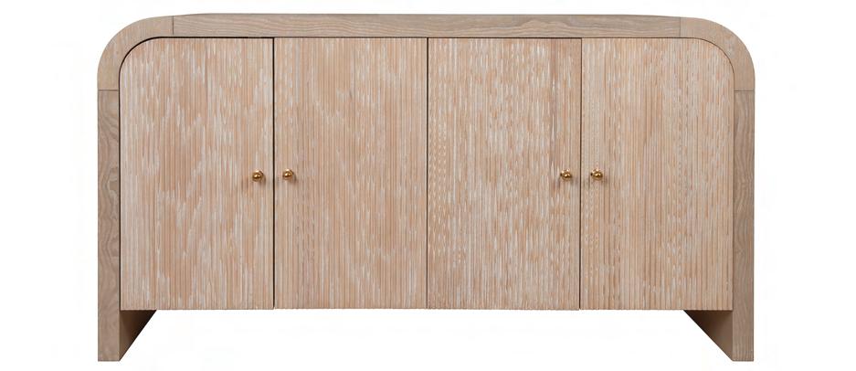 Four-door waterfall edge buffet with fluted door front in light cerused oak. 34h x 62w x 20d