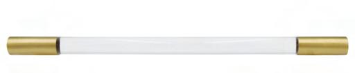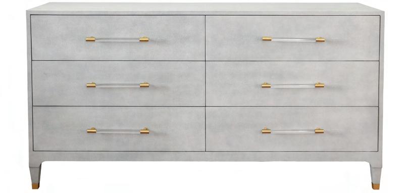 Two-door, three-drawer buffet with acrylic and brass hardware in light cerused oak. 33.75h x 58w x 18d