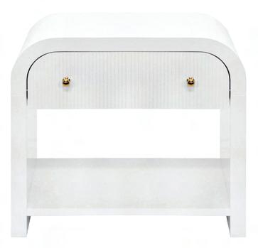 Four-door waterfall edge buffet with fluted door front in glossy white lacquer. 34h x 62w x 20d