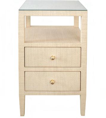 Four-door buffet in natural grasscloth with cerused oak handles. 32.50h x 64w x 20d