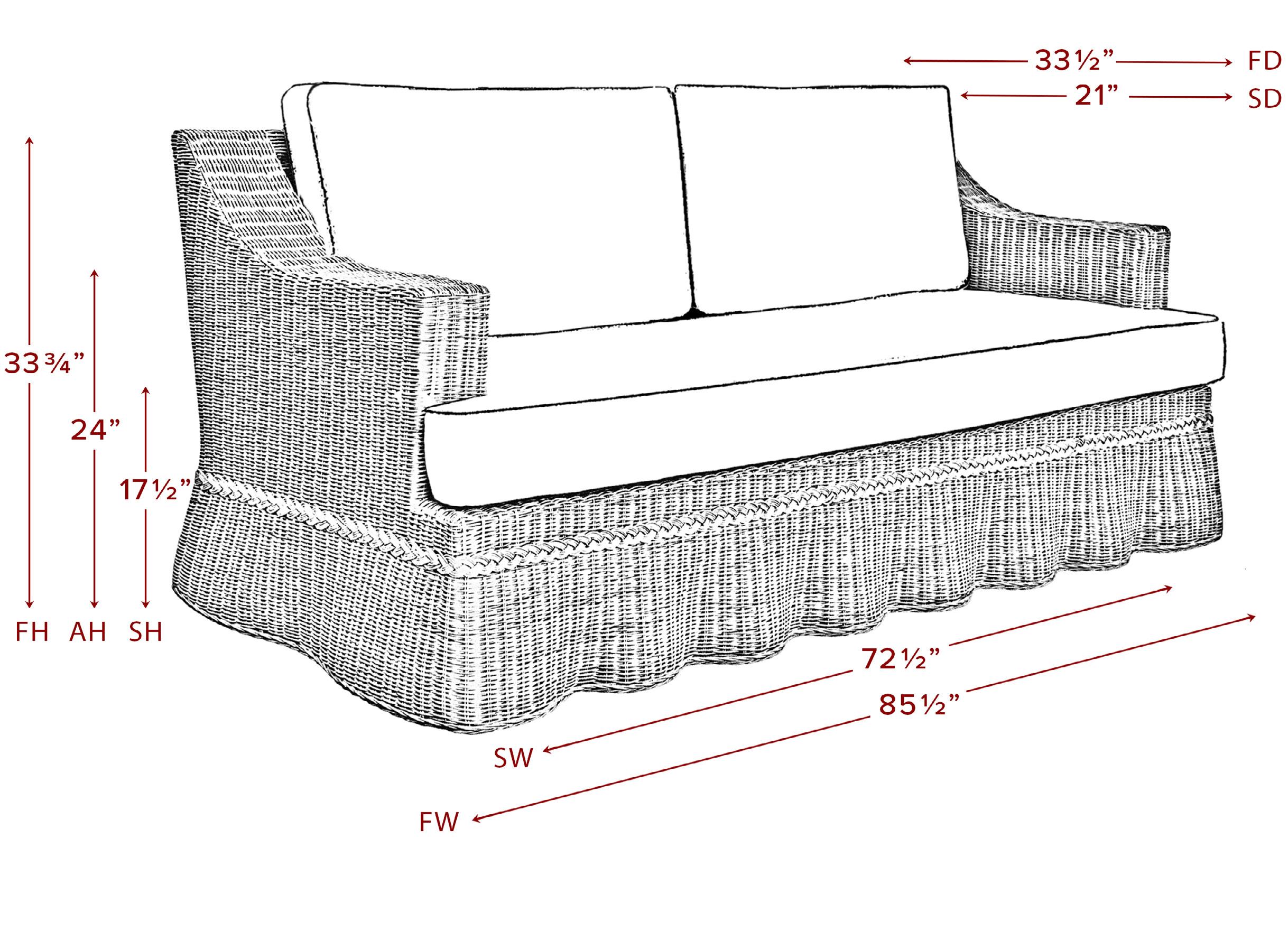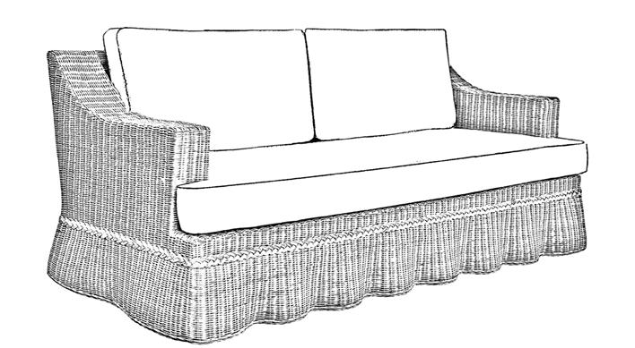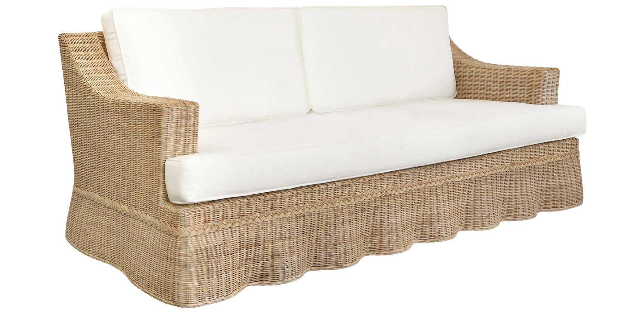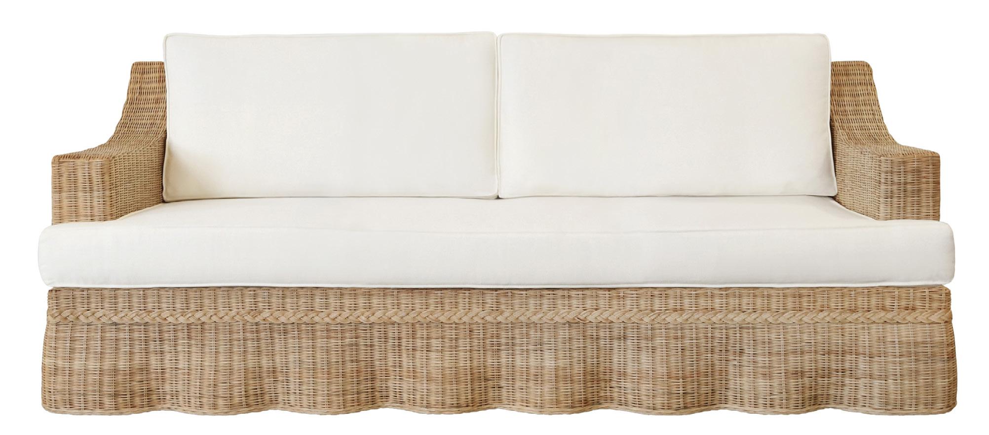 Lawson style sofa with natural rattan scalloped skirt in fabric of your choice