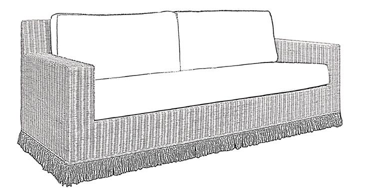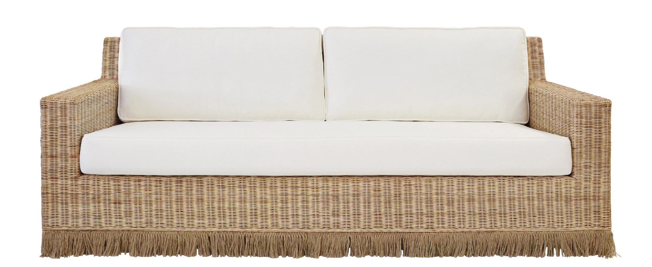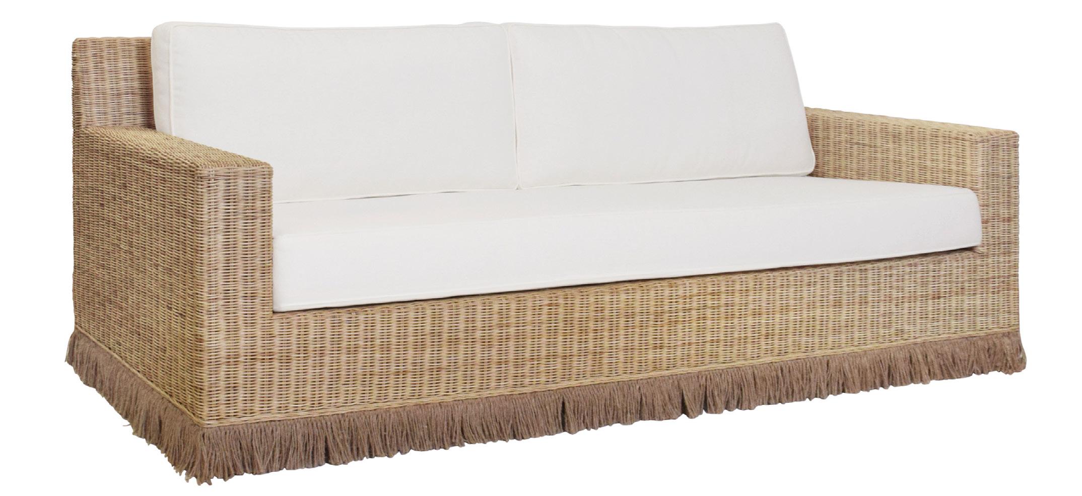 Lawson style sofa in natural rattan with jute fringe skirt i n fabric of your choice