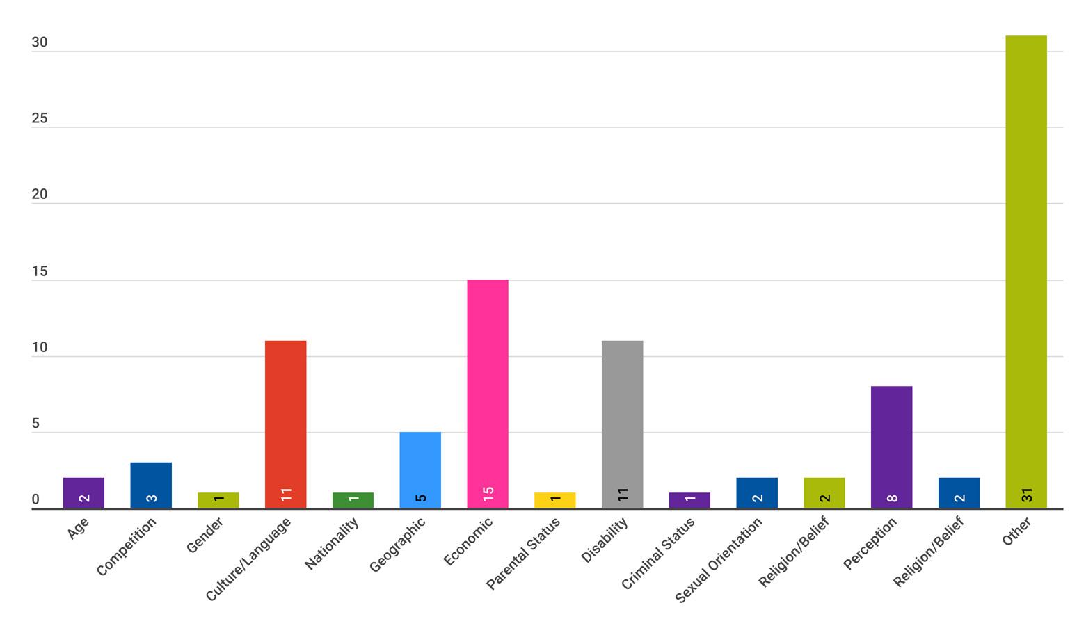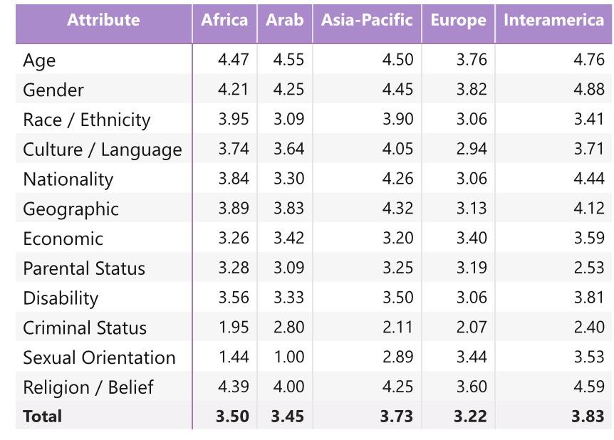 Some NSOs highlighted particular cases of positive perception when it came to the inclusion of people with disabilities (though this did not carry through in the averages) and regarding age. NSOs also identified challenges regarding the dimensions of sexual orientation, religion/belief, economic background, and gender.