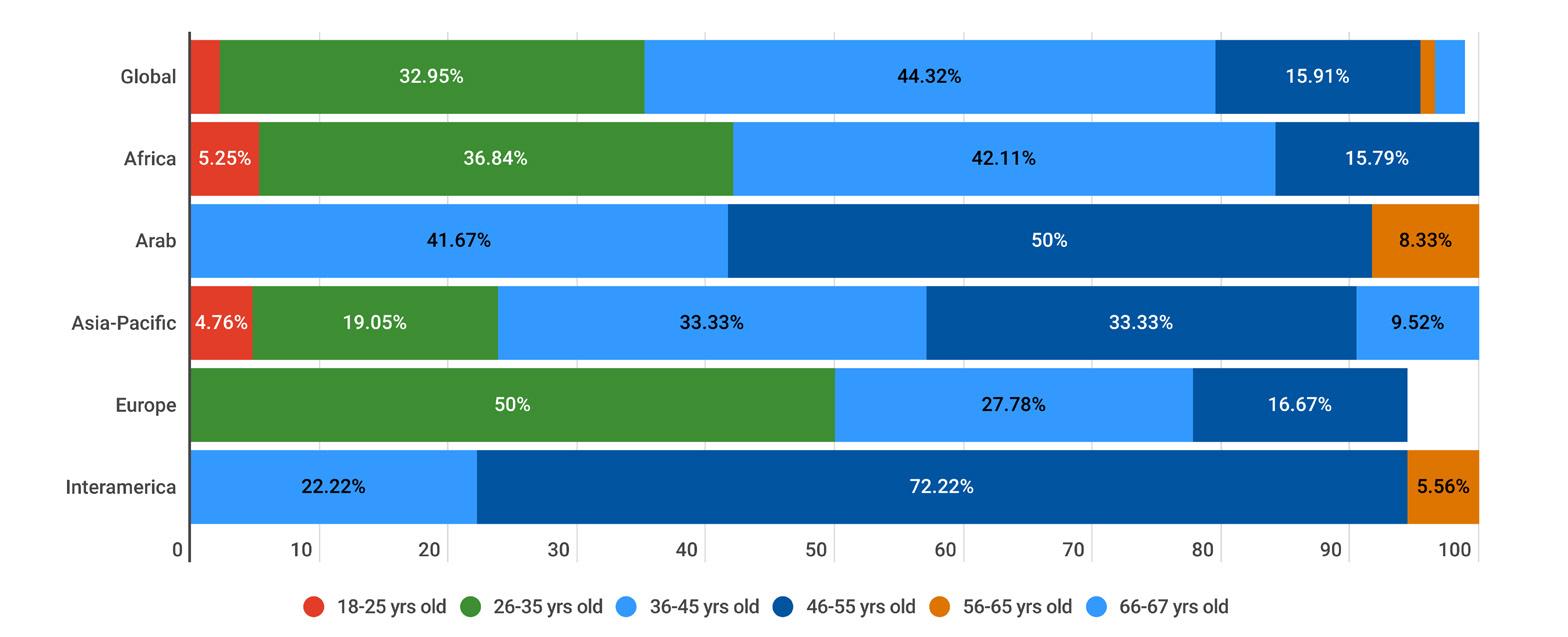 1. Age: NSOs have broadened their programme offerings to cover more age groups, particularly for pre-Cub ages (early childhood development). The average age range of adult volunteers in leadership positions is 36–45 years, followed by 26–35 years.