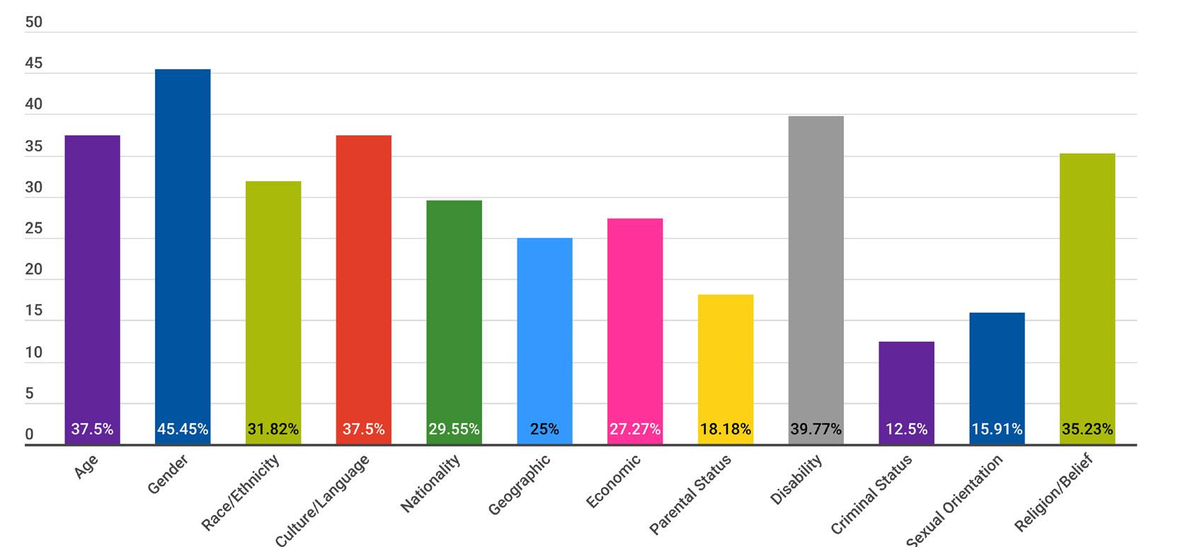 Figure 3: Percentage of the NSOs surveyed actively collect and use data on the diversity and inclusion of the following dimensions to inform diversity and inclusion initiatives.