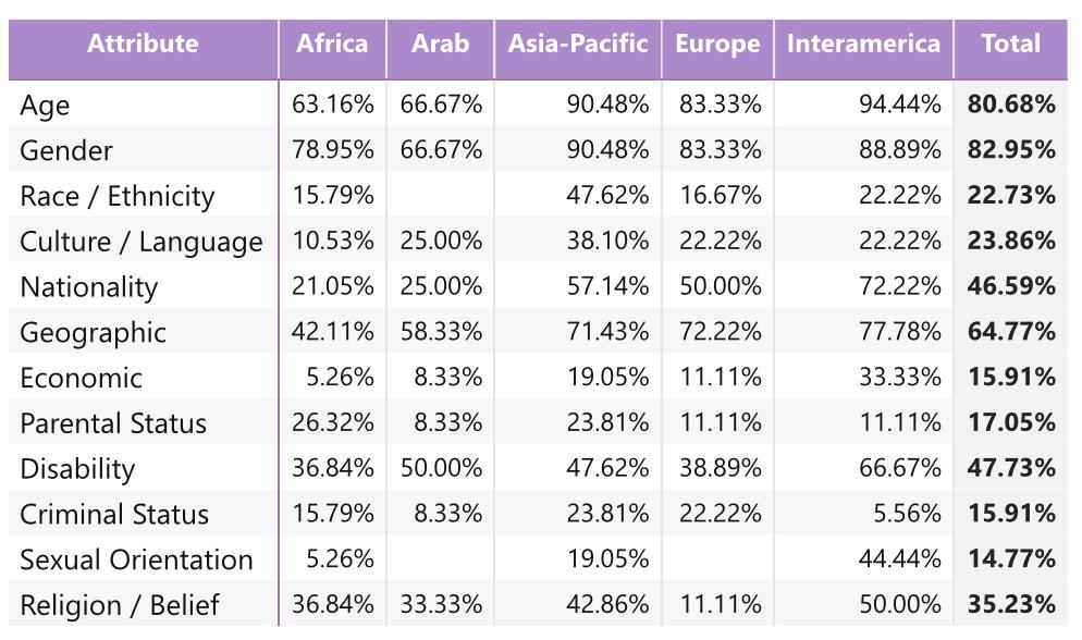 Age, gender, and religion are the areas more effectively addressed by NSOs. When looking into regions, Interamerica and Asia-Pacific believe they include a broader range of dimensions.