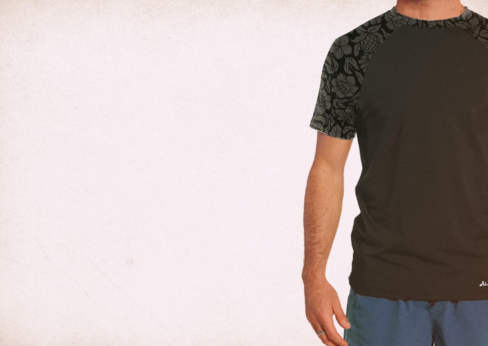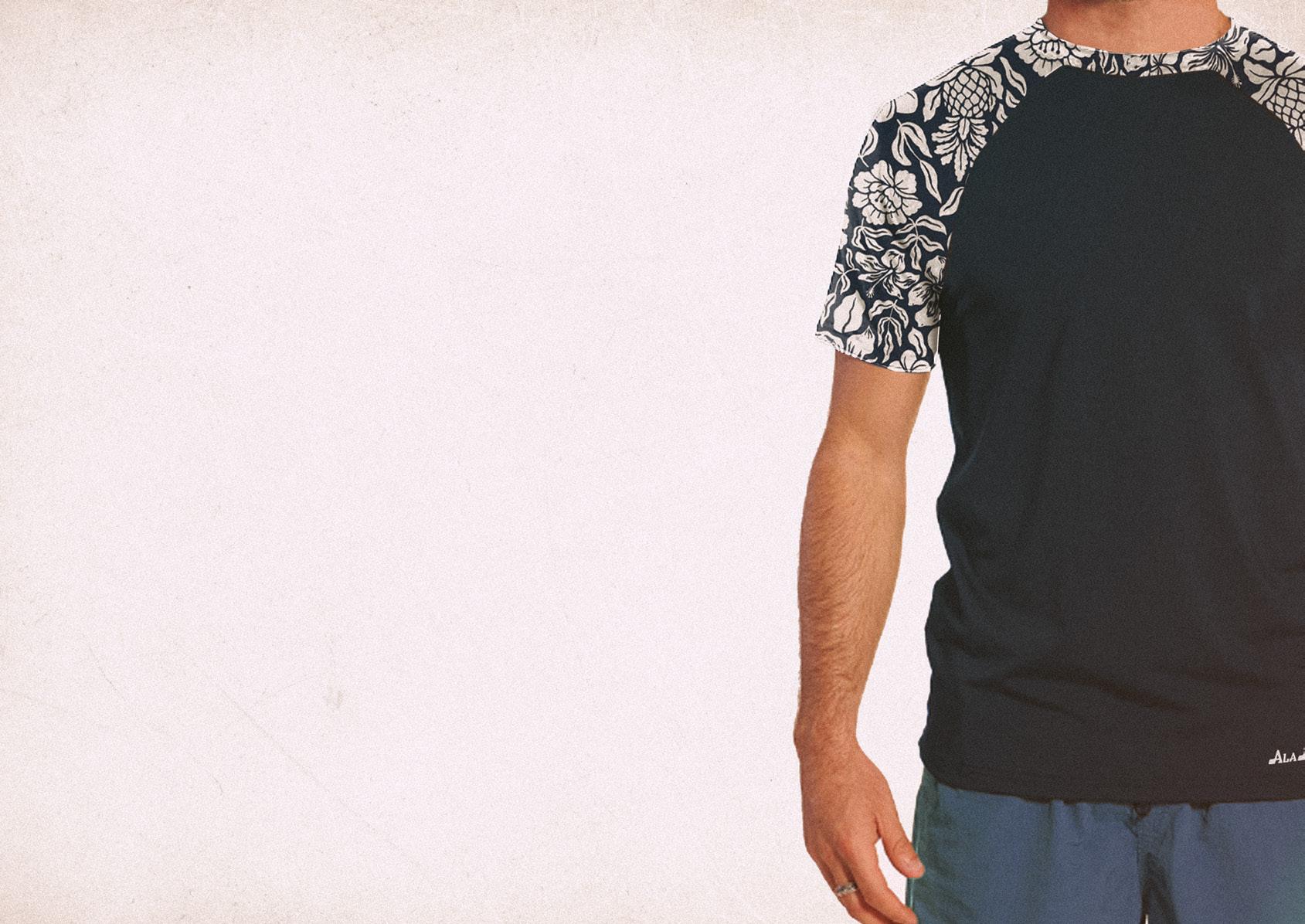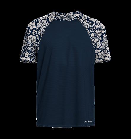 Lycra Microfibra con elastano UV+50. Remera ranglan manga corta combinada. Transfer en ruedo. Conector de boardshort. Regular fit.