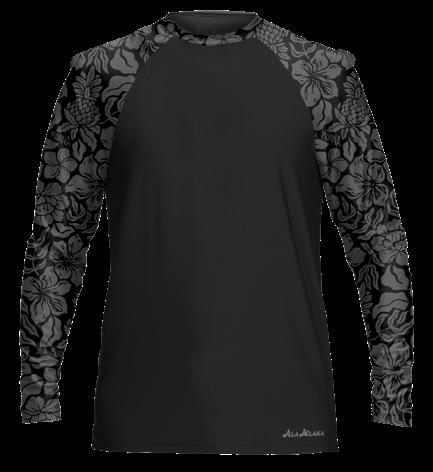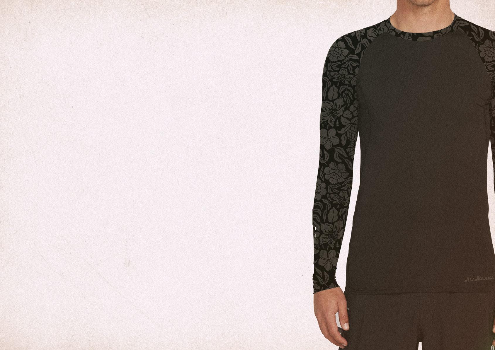 Lycra Microfibra con elastano UV+50. Remera ranglan manga larga combinada. Transfer en ruedo. Conector de boardshort. Regular fit.