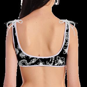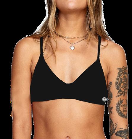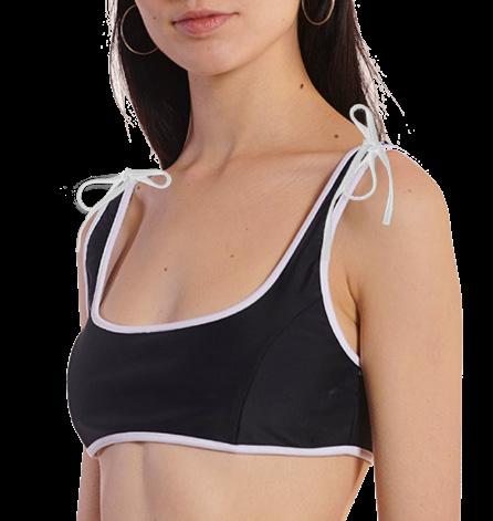 Lycra 85% Poliéster 15% Elastano - Bikini top liso con tiras para atar en espalda. Dije acrílico marcario en delantero.