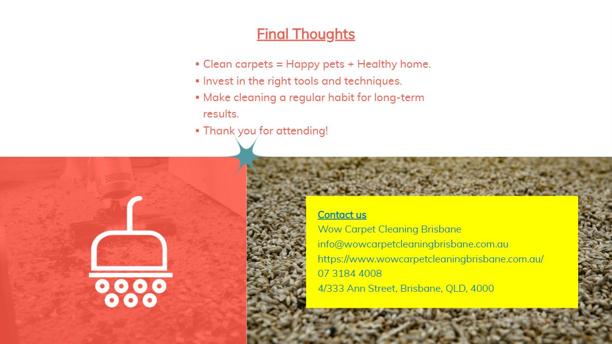 At Wow Carpet Cleaning Brisbane, we specialize in providing comprehensive carpet cleaning solutions tailored to the needs of pet owners. Our services not only eliminate stains and odors but also extend the lifespan of your carpets by removing deep-set dirt and allergens. With regular professional cleaning, you can create a cleaner, healthier, and more pet-friendly environment for your home. Contact us today to learn more or schedule a cleaning session!