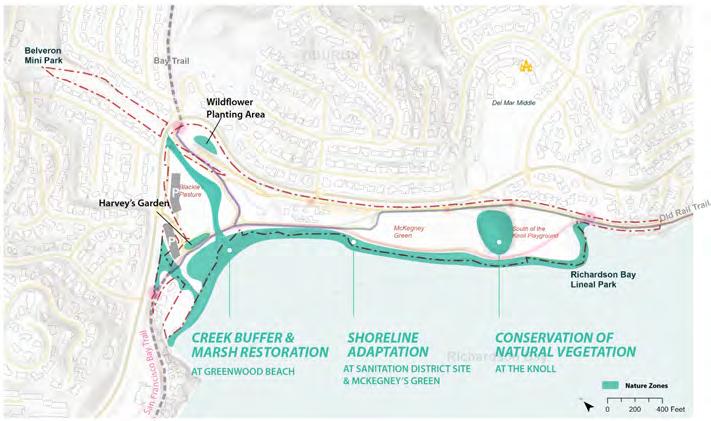 Incorporate sea level rise adaptation into park design at Richardson Bay, including consideration of the drainage through Blackie’s Pasture and nature-based improvements at Greenwood Beach.