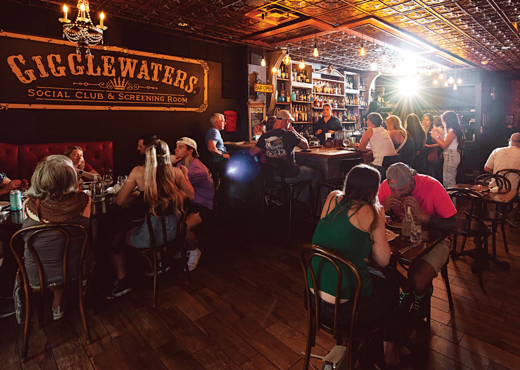 GIGGLEWATERS SOCIAL CLUB + SCREENING ROOM IS A RESTAURANT, BAR, AND CLASSIC MOVIE THEATER THAT LEANS INTO THE SWANKY AESTHETIC OF THE 1920S: TIN CEILINGS, EDISON LIGHTING, AND A CUSTOM BAR BUILT WITH WOOD FROM THE HISTORIC 1890’S.