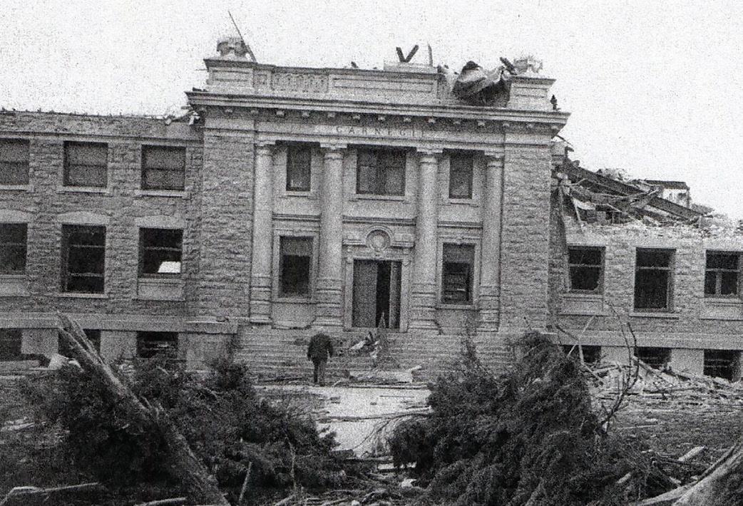 The Memorial Union: The above photo is the Union in 2020 and the below photo is the union after the tornado in 1966.