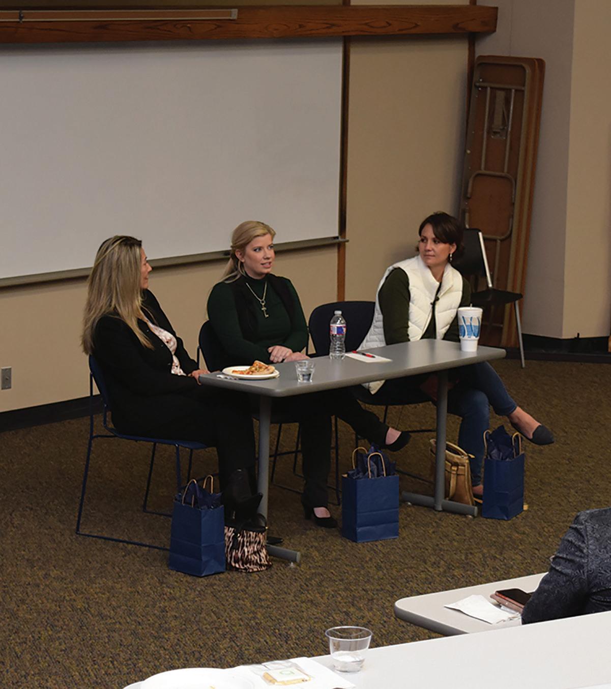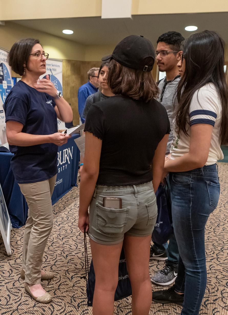 Brittney Clark, mass media major, introduces her parents to Andrew Anglin, assistant professor in mass media.