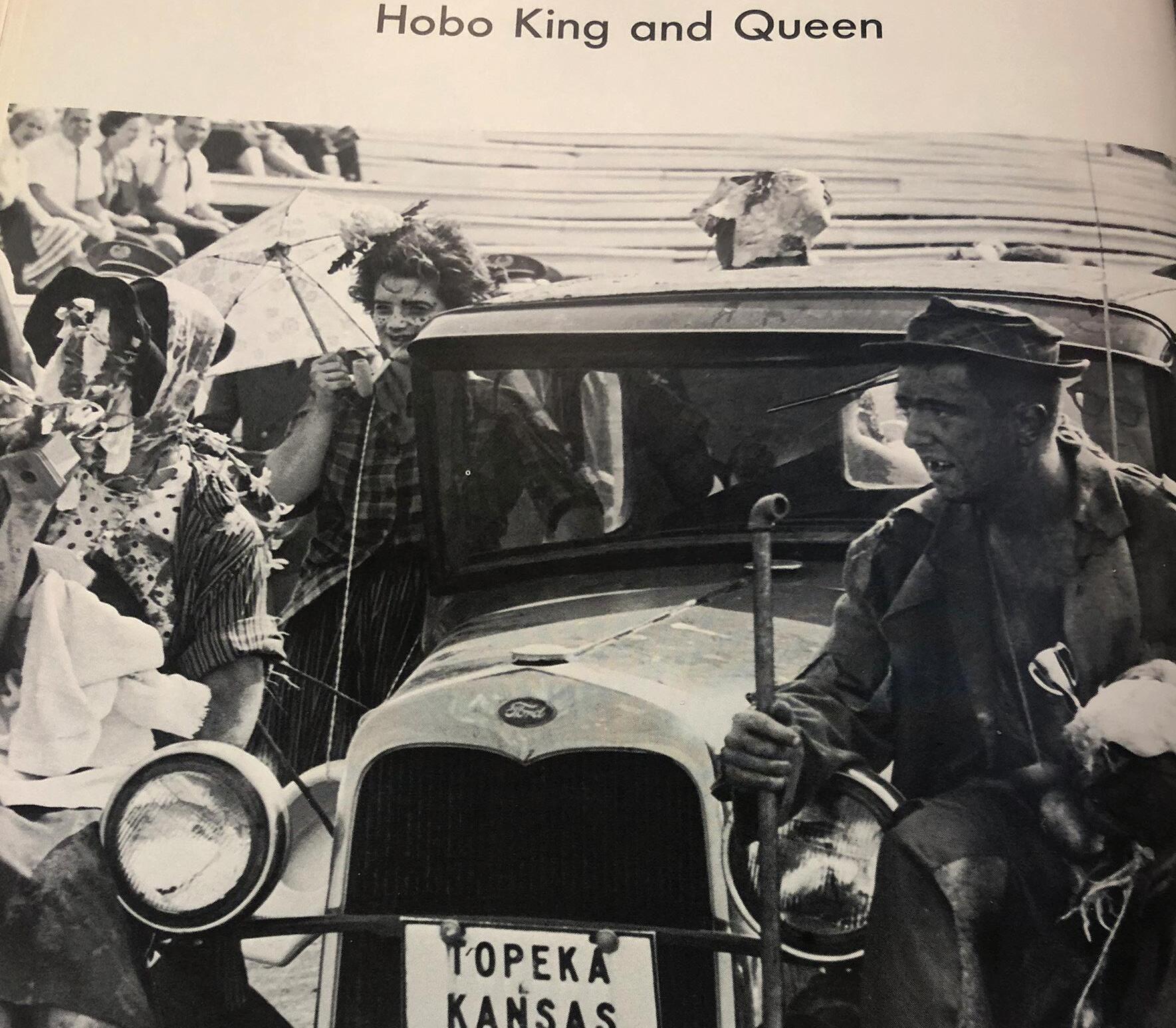 "There have been days when hobos dressed in barrels have wished those barrels had been more securely put together. On this day of jubilation classes are dismissed, and all loyal and happy hobos attend a hobo convention, choose their king and queen, parade and shout, and follow the march to the bread line, and "The Hobo Hop."