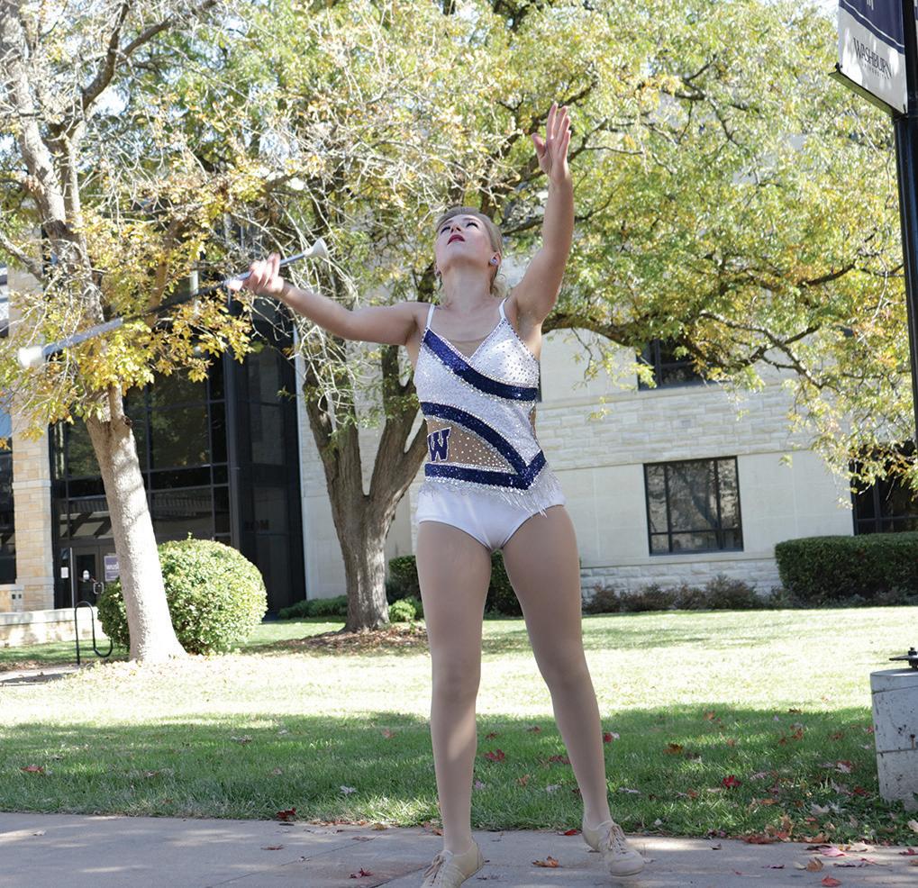 The Washburn University Marching Blues color guard falls in step with the band as they perform for tailgaters.