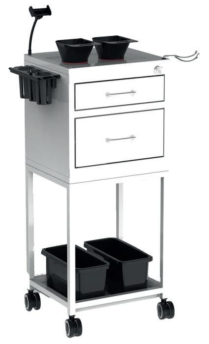 Metal Beauty Salon Trolley with lockable drawer, phone holder and dryer holder. Available in Black and white