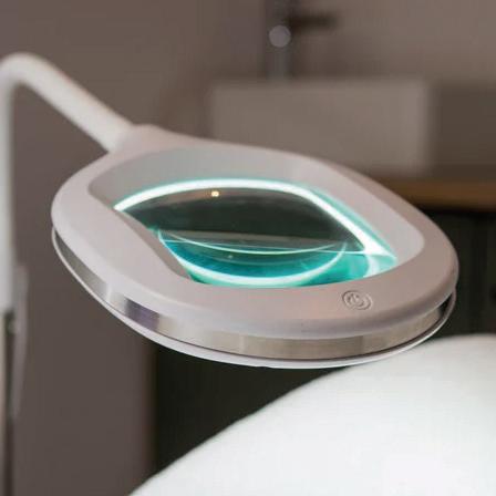 Perfect for placing over a beauty bed. It has a unique half-moon shape and comes with a continuous dimmer.