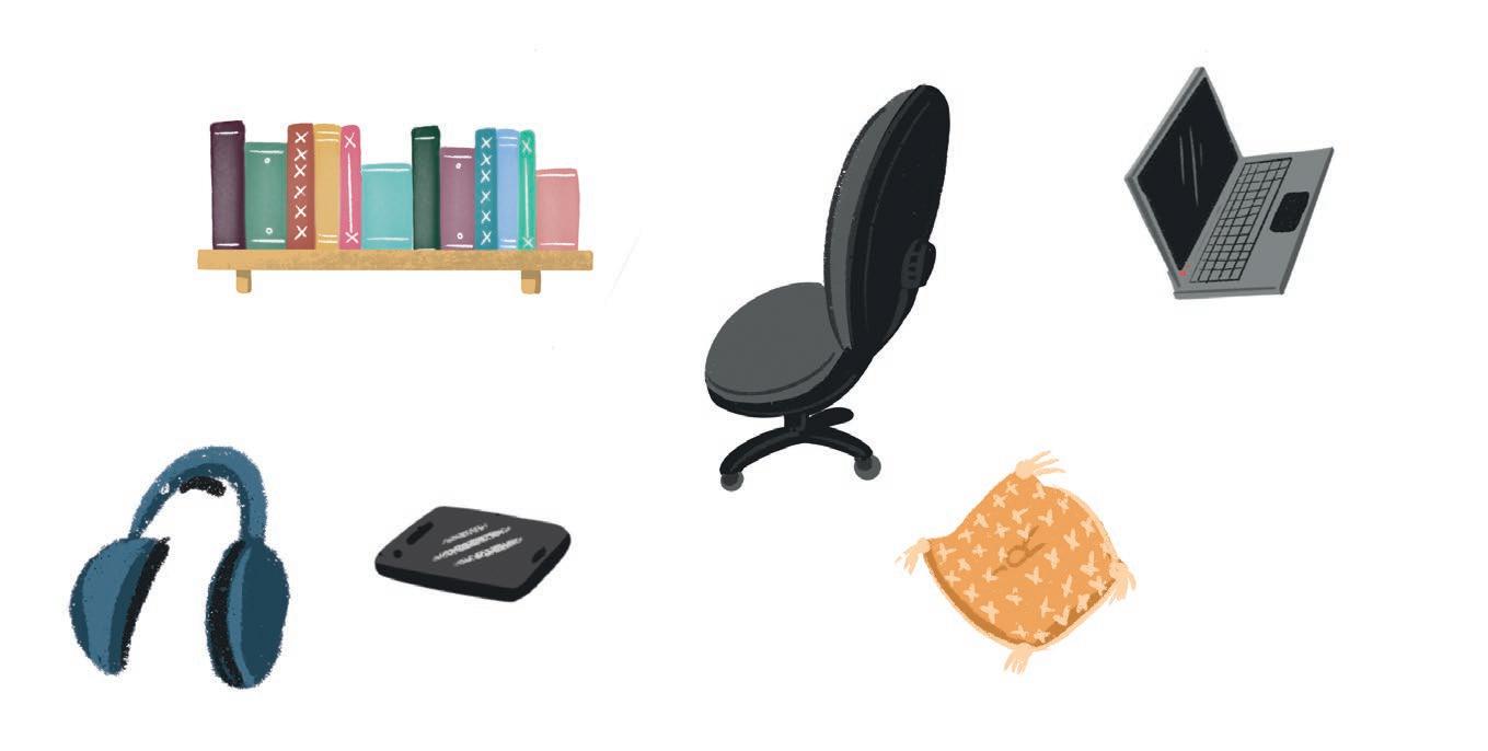2 der Kopfhörer der Drehstuhl der Laptop die Stehlampe die Spielkonsole die Pflanze das Geld das Handy das Kissen