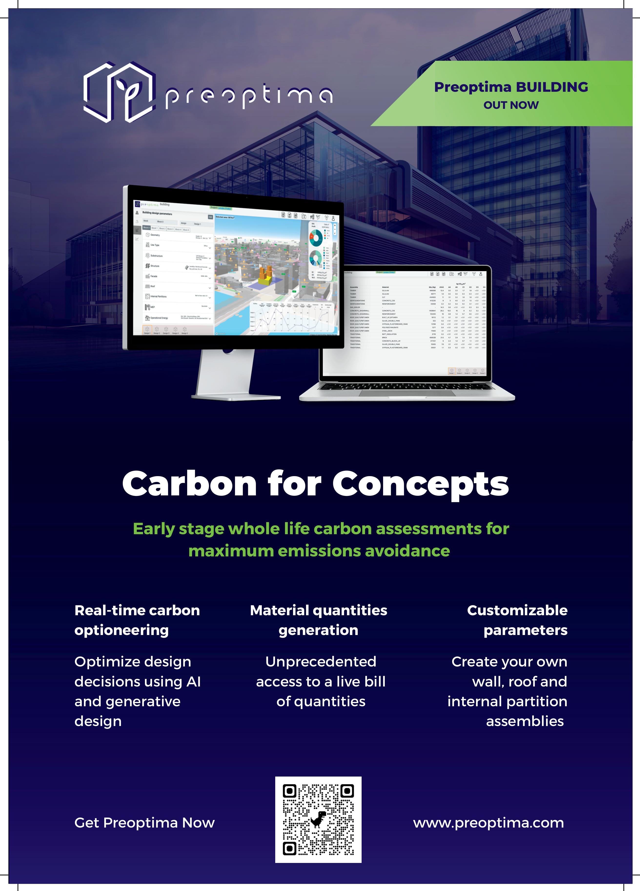 Preoptima has launched PreoptimaBuilding, an earlystage whole life carbon (WLC) assessment tool, that offers carbon optioneering in conceptual and technical designs using AI and generative design. Users can import geometry or use the generative design tool to quickly analyse thousands of low-carbon design iterations.