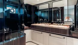 In particular, the furniture pieces are characterised by pronouncedcurves,andthedesigniscomplementedbyrugswith sinuous shapes that help define spaces in a non-traditional manner. A key feature ofthe first 74Steel is its diesel-electric system that provides more freedom in terms of layout, making it possible to repurpose technical spaces for recreational areas. This is especially evident in the expansive beach club and spa areas, which are significantly larger than those on a conventionalyacht ofsimilar size.