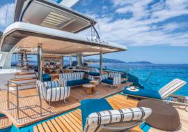 Designed in partnership with Azure Yacht Design, Limerence makes a striking impression with sculpted blue topsides contrasted against dark glazing that wraps around her bridge and main decks. The yacht’s explorer bow gives wayto an expansive aft section devoted to tender storage and serious aviation capabilities. Limerence is equippedwith a fully certified commercial helideck – designed to accommodate large helicopters like the Bell 429 or Airbus H145 – and goes further with integrated bunkering capability to refuel onboard. Limerence carries four performance tenders, including a custom Wajer 38S, a 12.5m X-Tender, a Ski Nautique GS20, and a rescue RIB. She also features a full dive center with 10 full dive sets as well as free diving and spear fishing. After sunset, the yacht transforms: the beach club becomes a candlelit dining venue, the helipad a nightclub with full DJ and AV setup, or an open-air cinema under the stars.