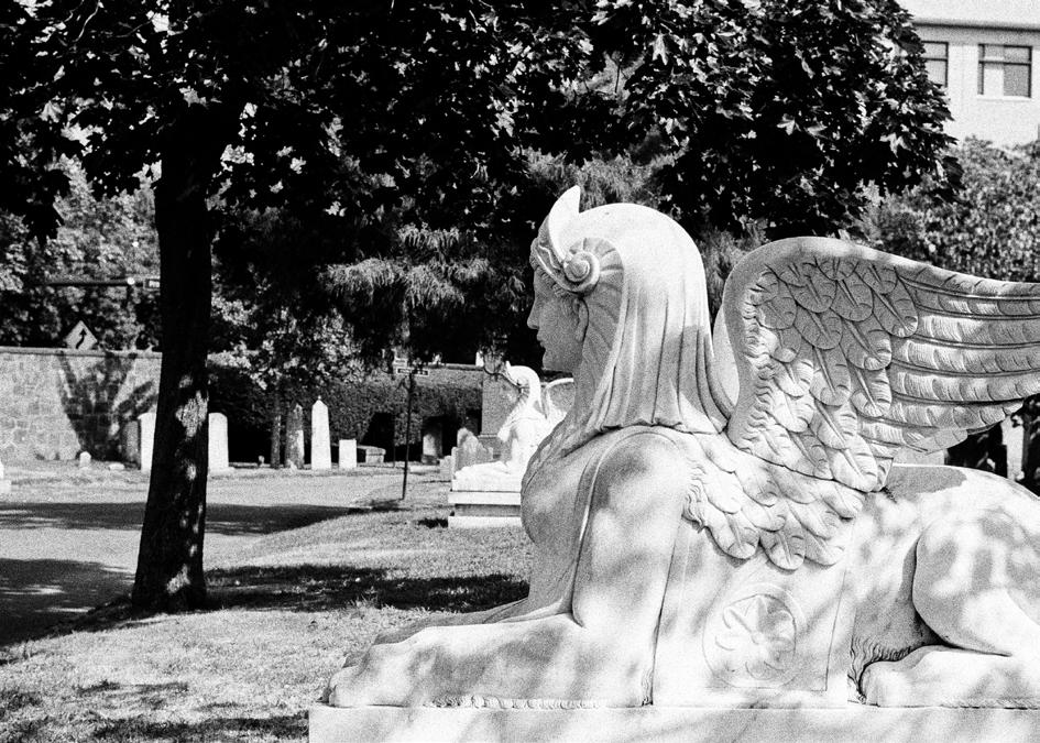 This city is the Grove Street Cemetery. “The Dead Shall Be Raised” is its rallying cry. This Corinthians verse clashes with the Egyptian-inspired Pharaonic gate that opens into this world. The brick office behind the gate offers several pamphlets for visitors. There is one for bench markers, another for an arboretum tour outlining the 40 species of intentionally planted Northeastern trees, a glossed trifold with Civil War soldiers, and, finally, a solemn inquiry form for new burials. They all smell like cigarettes.