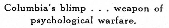 Columbia’s elaborately planned aerial attack to demoralize the student body of Yale before tomorrow’s game fizzled yesterday afternoon when a blimp passed virtually unnoticed over New Haven and unsuccessfully attempt to bombard the campus with 5,000 “Safe Conduct Passes” to Baker Field.