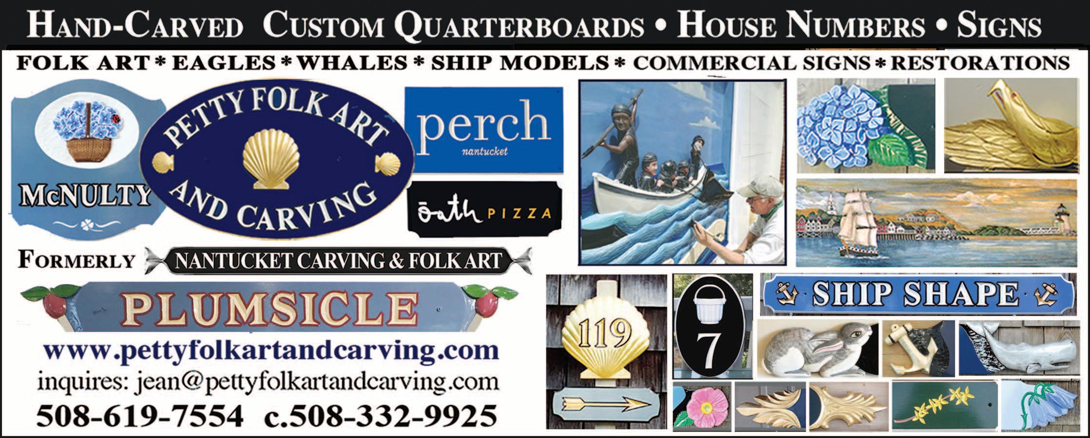 Page 6 Yesterday’s Island/Today’s Nantucket Vol. 53 No. 2 • YesterdaysIsland.com May 18-31, 2023 Yesterday’s Island/Today’s Nantucket CELEBRATING 53 YEARS! yesterdaysisland.com Box 626 Nantucket, MA 02554 • 508-228-9165 • Fax: 508-228-1348 Suzanne M. Daub - Publisher & Editor Writers - Robert P. Barsanti, Dr. Sarah T. Bois, Steve Tornovish Production & Design - Sarah Morneau • Website & Databases - J. Taryn Daub Cover Photographs - Evelyn D Eletto, Steve Tornovish, Michael Torrisi, YI Staff Ethan & Anora: Packing for Nantucket • Solveig: Missing her cousins Yesterday’s Island is published from April - November in print and online year-round. Established in 1970. The publisher reserves the right to review all material submitted for publication & will not be responsible for any and all misinformation, misprints, typographical errors, incorrect or misleading content of advertisements, etc. which might appear in this publication in print or online. continued on page 8 Today’s NantucketEvents & Entertainment Events are updated daily at Nantucket.net Nantucket Chocolate Covered Cranberries The Courtyard, 16 Straight Wharf Call 508-228-1017 or Order online www.auntleahs.com As seen in Martha Stewart Weddings, InStyle Magazine, Phantom Gourmet and on Chronicle, Channel 5 “The Best Fudge in The World” AUNT LEAH ’S F UDGE Stop in for a taste Gail’s Tours, Inc. Simply, the finest tour on Nantucket Island! Continuing a family tradition of hospitality Unique, in-depth tour of Nantucket 7th generation native Convenience...effortlessly view Nantucket In-town pick-up • 1-3/4 hour tour Pullovers for photo opportunities Tour van holds up to 14 guests Departures daily 10am, 1pm, & 3pm Value...in the thrifty Nantucket tradition GAIL NICKERSON JOHNSON your guide to the real Nantucket! RESERVATIONS & INFO: 508-257-6557 VOTED BEST OF NANTUCKET FOR MORE THAN 25 YEARS! ★ ★ ★ ★ Fabulous Food! Fun Atmosphere! Fair Prices! AFFORDABLE MENUS • PUB DINNER • KIDS • PIZZA • TAKEOUT PARTIES • OUTSIDE DINING Nantucket’s Family Restaurant and Sports Bar Atmosph Fun Foo aily thefaregrounds o om t ro 5 minutes fr airgrounds R 27 F 508-228-409 Open 11:30am D ere! d! .com wn! oad 5 aily antucket’s vailable ds A Gift Car ood dable F table, Affor Comfor ou Can Eat Specials All Y Daily Specials DINING • • • • T • N Sail Endeavor a Nantucket tradition. established 1982 Private Charters Per Person Fares Captain James Genthner Slip #1015 • Straight Wharf 508-228-5585 EndeavorSailing.com