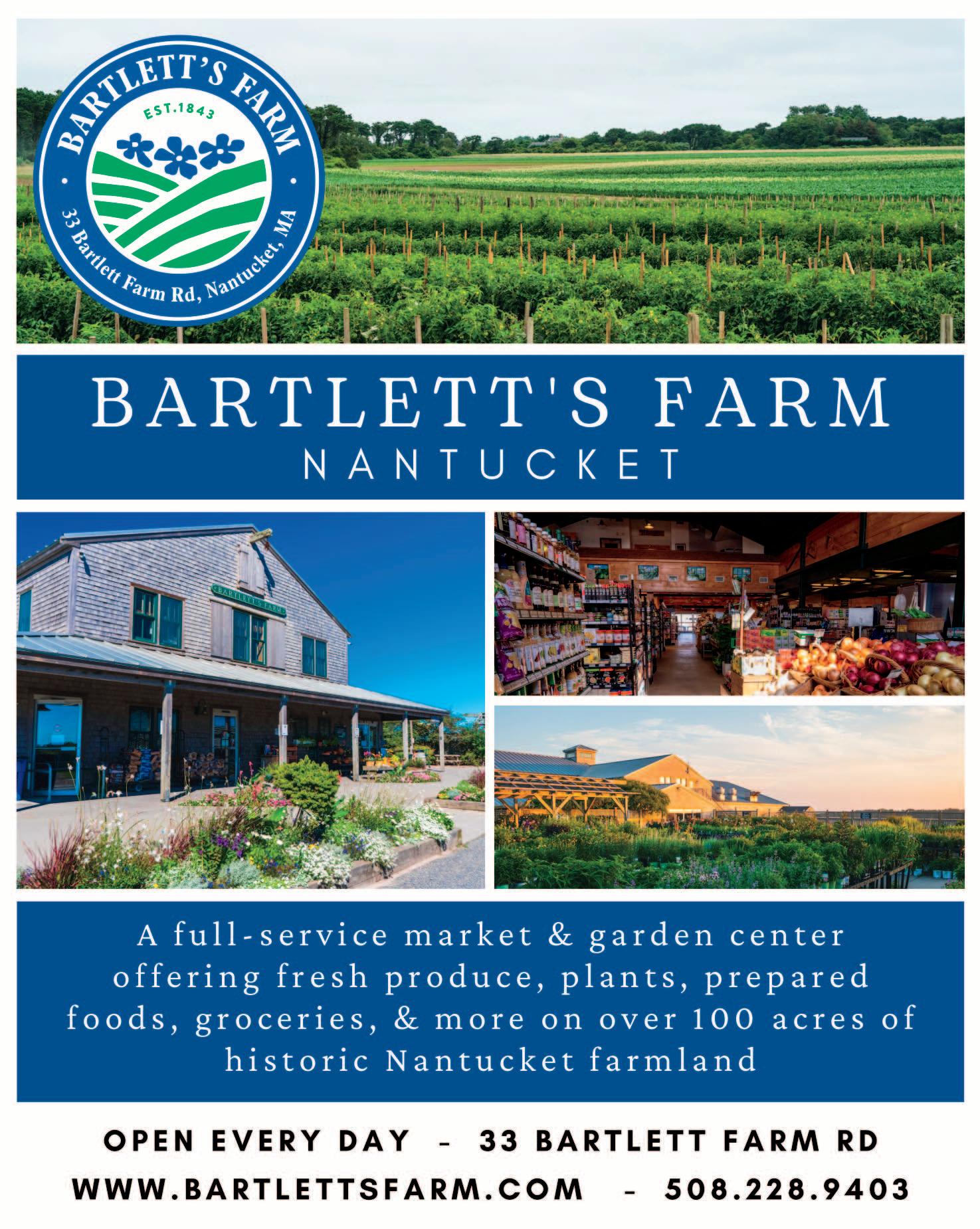 Farm Grown Produce | Garden Center | Groceries | Beer & Wine | Breakfast, Lunch & Dinner To Go A 7th generation family farm growing fresh vegetables on 200 acres of historic Nantucket farm land. Find our full service grocery store onsite with specialty items like quality meats, artisanal cheeses and dairy, olive oils, organic snacks, and more. Order groceries and made to order foods online at Bartlettsfarm.com. Peruse our selection of ‘well-farmed’ wines, craft beers and ciders. Our FARM KITCHEN offers take-out breakfast sandwiches, muffins, pastries, coffee and tea…for lunch we have sandwiches, lobster rolls, clam chowder...dinner specials include roast turkey, veggie curry, and prime rib dinner. Grab lunch on your way to the beach, or food and beverages for your BBQ on the way home. Bartlett’s Farm, Who’s Your Farmer? bartlettsfarm.com