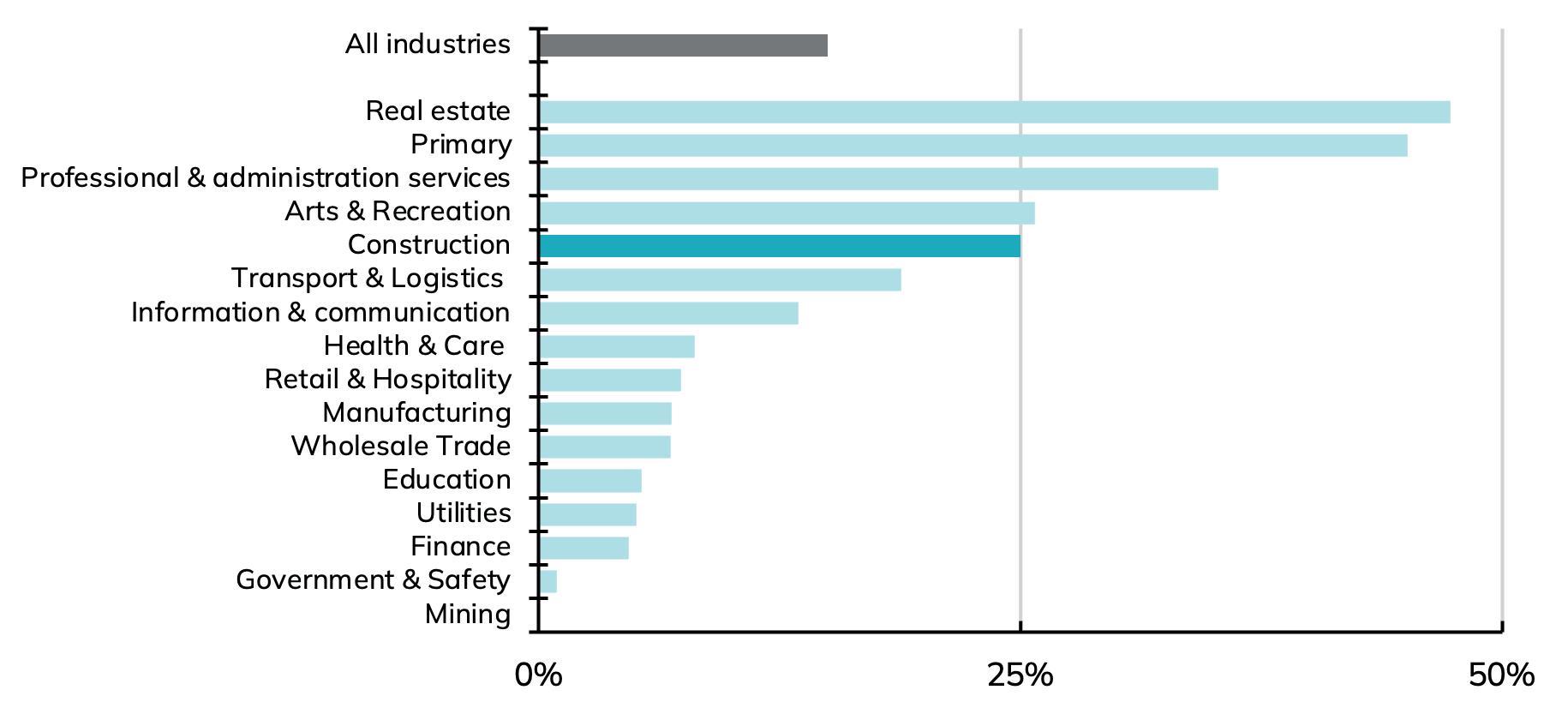 图2:建筑业为新西兰提供了57.6万个工作岗位,占全国总工作岗位数量的20%