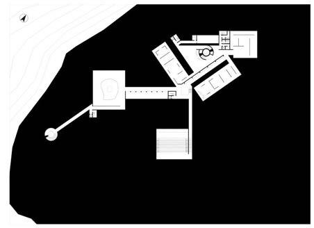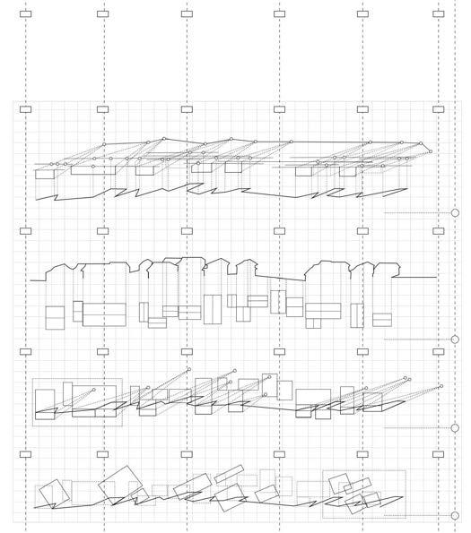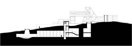 The sectional drawings illustrate the relationship between the terrain, relics, and the underground gallery. They also demonstrate how the crevices function spatially to introduce light, provide viewpoints, and serve as entrances.