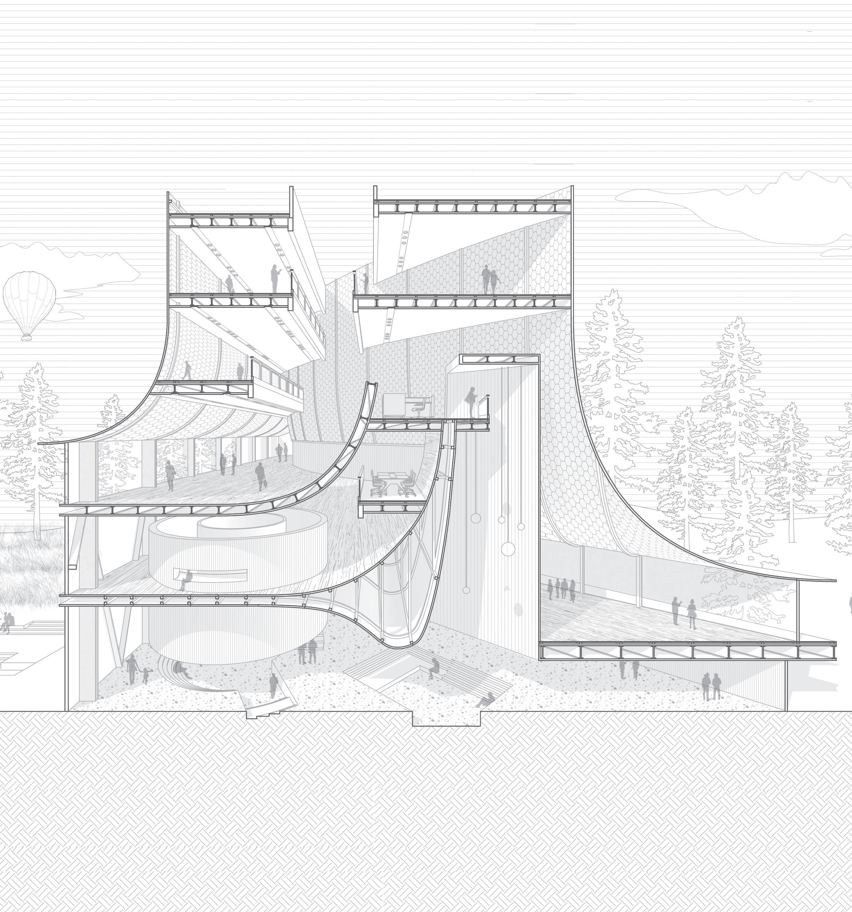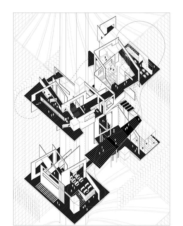 This exploded view focuses on the internal flow of the space, showing the organization of the curved roof and the lower space, as well as the different activities generated by people in the different spaces.