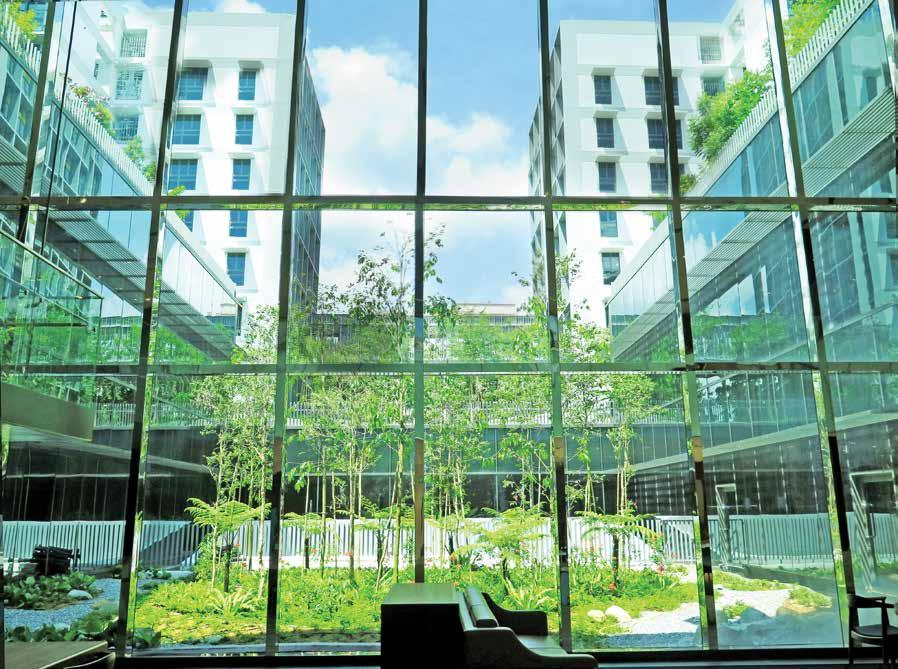 Cermin juga mencerminkan cahaya dan kehijauan dari halaman tengah. Dengan ini, taman telah bergabung dengan pusat perubatan.