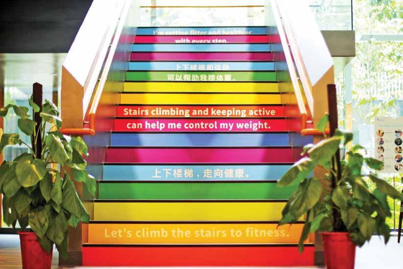 Reka bentuk kami yang mempromosikan kesihatan meggalakkan orang di kawasan penerimaan mengambil tangga di depan mereka dan bukannya mangambil lif yang berada di belakang mereka.